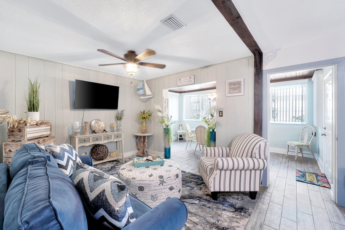 Steps to Main Street and minutes to beaches, yet tucked away on a downtown side street. Private yard with grill in a prime location. Walk to restaurants, breweries, shops, and live music. Stroll to stunning sunsets or drive minutes to award-winning beaches such as Honeymoon Island, Caladesi Island & Clearwater Beach. Designer decor. Sleeps 6. Two king bed suites and a luxury couch that sleeps 2 more. Fully loaded for kids, pets and beach days. Treat yourself and book this Dunedin favorite today.