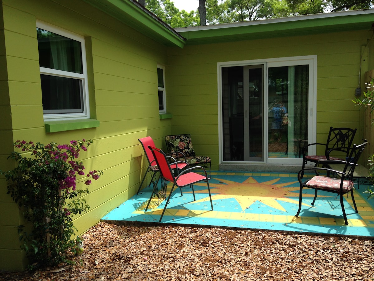 Totally remodeled 1960's bungalow with retro old Florida furnishings, two bedrooms with comfy new mattresses on 3 beds, and a foldout bed to sleep extra guests. Comes equipped with everything you need for a great vacation! Full kitchen, dining area, and private yard with mature trees. Free laundry facilities on site. Perfect for families- and pets are welcome too! Parrot Park is a shady and quiet vacation retreat, located a short walk from restaurants, nightlife and Gulfport beach!