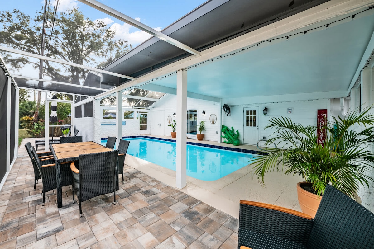 Paradise Palms is a tropical 3BR getaway in Tampa Bay, just 15 min to Clearwater Beach and 5 min to Indian Rocks Beach. Enjoy a private heated pool (no extra fee), game room, fire pit, and kid-friendly playset with toys. Perfect for families, couples, or friends; close to beaches, dining, and attractions. Relax, play, and make unforgettable Florida memories. 🌴✨