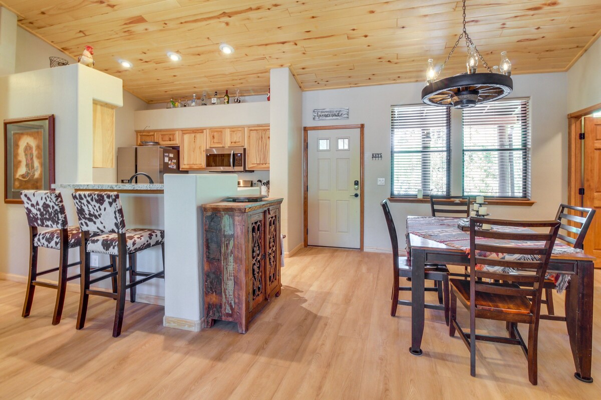 Dogs Welcome | Remote Work Friendly | Outdoor Entertainment Space | Torreon Community Amenities with a additional FEE | Bicycles and Golf Cart with Waiver. Come stay at our remodeled Torreon Cabin with an expanded deck & outdoor fireplace and experience a memorable Show Low cabin getaway in the heart of Arizona’s White Mountains within Cardinal Landing Gated neighborhood. This charming 2-bedroom, 2-bath vacation rental cabin is perfectly situated near forest trails and Fool Hollow Lake, making it an ideal home base for outdoor enthusiasts, families, and couples seeking a peaceful mountain escape. Step outside and enjoy immediate access to hiking, biking, fishing, and boating, with scenic pine forests just moments away. During the winter months, take advantage of nearby Sunrise Park Ski Resort and Arizona Snowbowl for skiing, snowboarding, and snow play. In warmer seasons, enjoy cool mountain air, wildlife sightings, and endless opportunities for outdoor adventure. After a full day exploring Show Low and the surrounding White Mountains, relax at the cabin by gathering around the outdoor fireplace or unwinding inside the cozy living spaces designed for comfort and connection. The thoughtfully laid-out interior provides everything you need for short or extended stays, blending rustic charm with modern convenience. Located in a quiet, wooded setting yet close to local dining, shops, and attractions, this Show Low vacation rental offers the perfect balance of privacy and accessibility. Whether you’re planning a weekend escape, a family vacation, or a seasonal mountain retreat, this cabin delivers year-round comfort, adventure, and unforgettable memories. The Property TPT-21384743 | STR-00186 Sleeping Arrangements Bedroom 1: King bed Bedroom 2: Queen bed, twin bench pull out Community Amenities Listed Below (Passthrough Torreon Guest Fees) 1. Recreation Work Out Center 2. Kid-friendly recreation areas, fishing, and basketball court 3. Tennis & Pickleball Torreon Onsite bar, restaurant, golf shop, and hiking trails Open to All Guests Outdoor Living Spacious deck with comfortable seating Gas grill with infrared cooking technology Outdoor wood-burning fireplace - Gas Starter Smart TVs with Apple TV Indoors and Outdoors Golf Cart & Bicycle Use - With Liability Waiver Indoor Living Smart TVs with YouTube Live TV on Apple TV Gas fireplace, DVD player Dedicated workspace with Apple MAC Mini, Apple monitor, and printer Kitchen Fully equipped with major appliances, including dishwasher Drip coffee maker and Keurig with starter pods Cooking essentials, dishware, and flatware General Free WiFi Air conditioning Linens, towels, and complimentary toiletries Smart thermostat and Smart Locks Self Checkin With Entry Codes Computer station, radio, and alarm clock Parking Garage for 1 vehicle Remote Garage Access with iPhone or Android App Driveway space for 2 vehicles Additional Information Torreon golf course is not available for guest use Community clubhouse is open from Memorial Day weekend to Labor Day weekend Community amenities are available for an additional fee: $275 for the primary guest, $75 per additional guest (up to four guests). Access is limited to two times per month, coordinated with the guest contact. Pet-friendly with a $250 fee for up to two dogs No smoking, parties, or events permitted Photo ID may be required at check-in