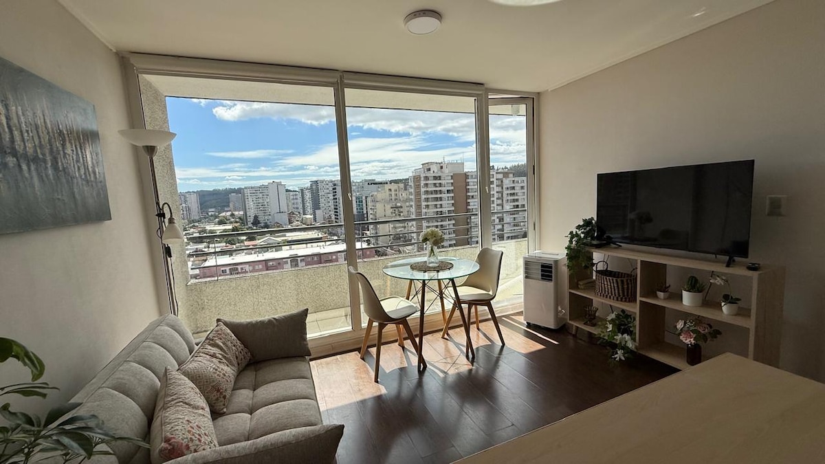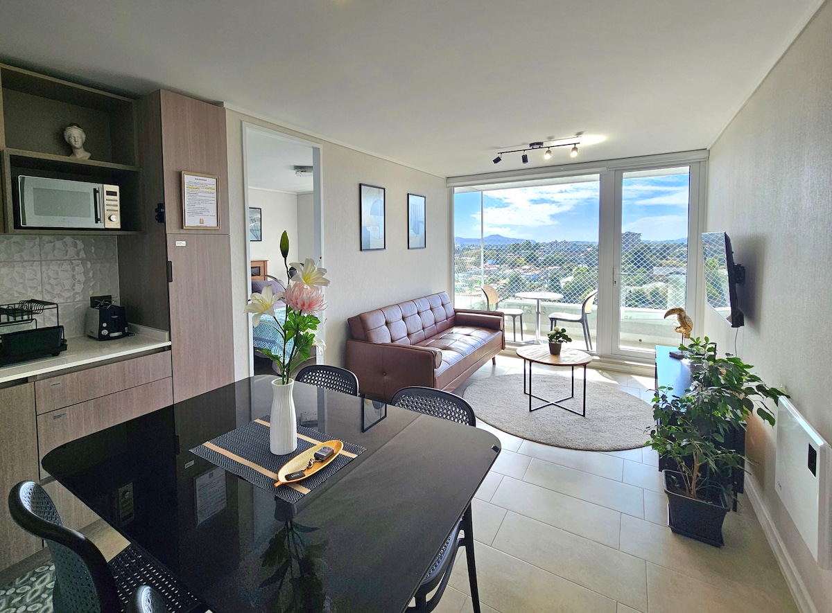 Disfruta de este departamento nuevo, full equipado para dos personas, cerradura inteligente, céntrico y muy cómodo, ideal para alojarse en Concepción. A pasos de la Universidad de Concepción, Hospital Regional, Tribunales, etc El edificio cuenta con Seguridad conserjería 24/7, Circuito Cerrado de Tv, Estacionamiento privado Subterráneo y Lavandería del edificio
