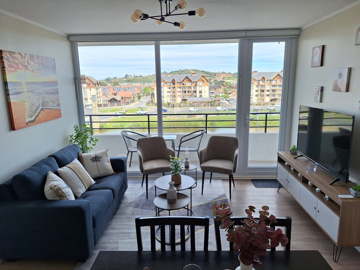 Hermoso departamento, con vista panorámica. Situado en Condominio cerrado, seguro; cuenta con playa de uso exclusivo del condominio, además de 2 zonas de piscinas y juegos. Cercano a Dichato; puede irse caminando a Caleta Villarrica o continuar hasta Dichato donde hay diversas ofertas gastronómicas. También caminando a playa Pingueral; con diversas alternativas de paseos. Cuenta con 2 dormitorios, cada uno con baño completo. Dormitorio 1: cama King Dormitorio 2: 3 camas 1 plaza y escritorio.
