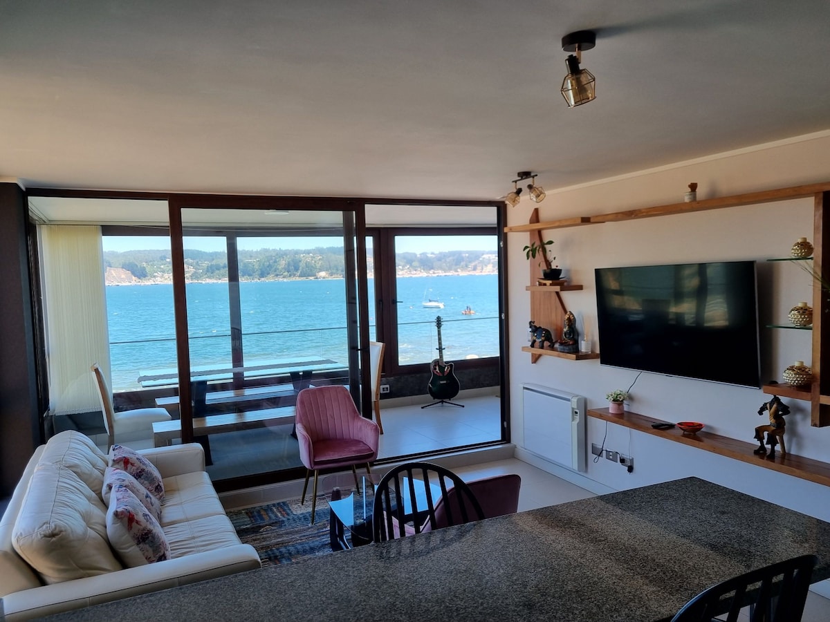 • A solo 40 minutos de Concepción, con increíble vista al Mar, nos reciben 120 M2 en primera línea de playa. Departamento de lujo, con amplio living - comedor, 3 dormitorios, 2 baños, moderna cocina con loggia independiente, amplia terraza panorámica con segundo comedor, sofá seccional y elegante cierre de cristal SunFlex para disfrutar todo el año. • Equipado para 6 personas, condominio privado con seguridad 24/7, cable, wifi, piscinas, playa, club náutico, quinchos, canchas de tenis y pádel.
