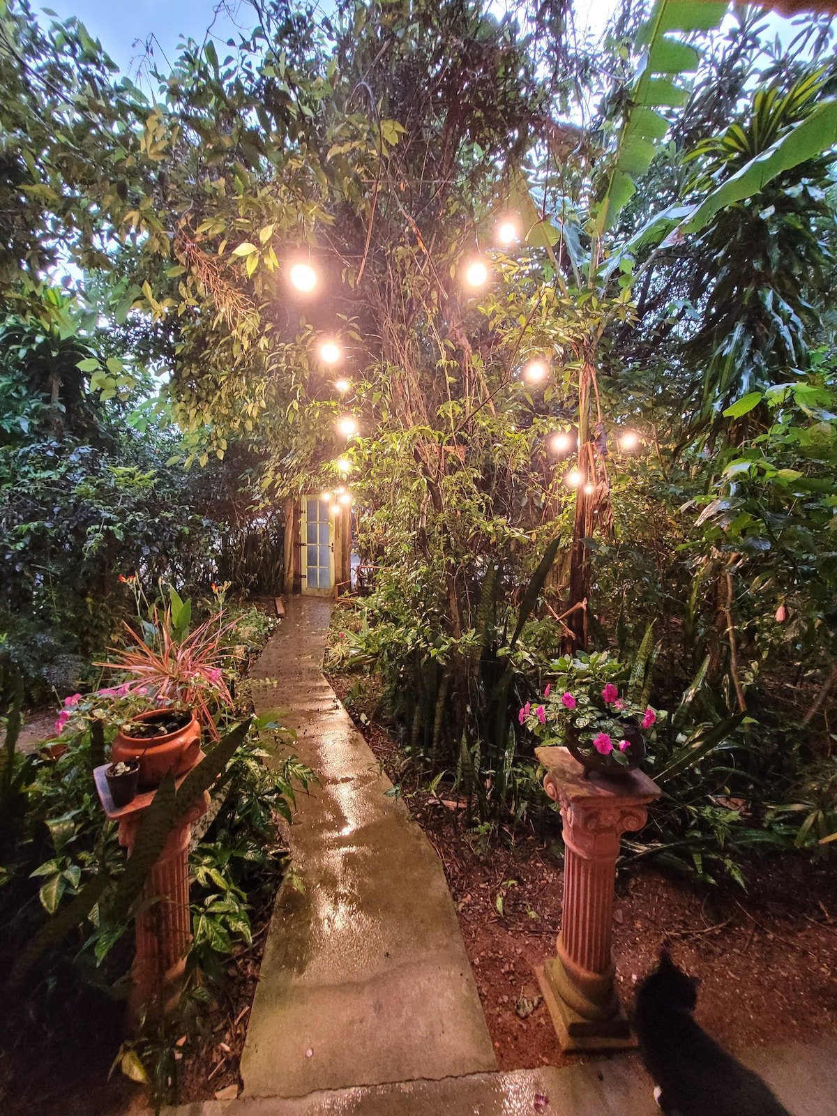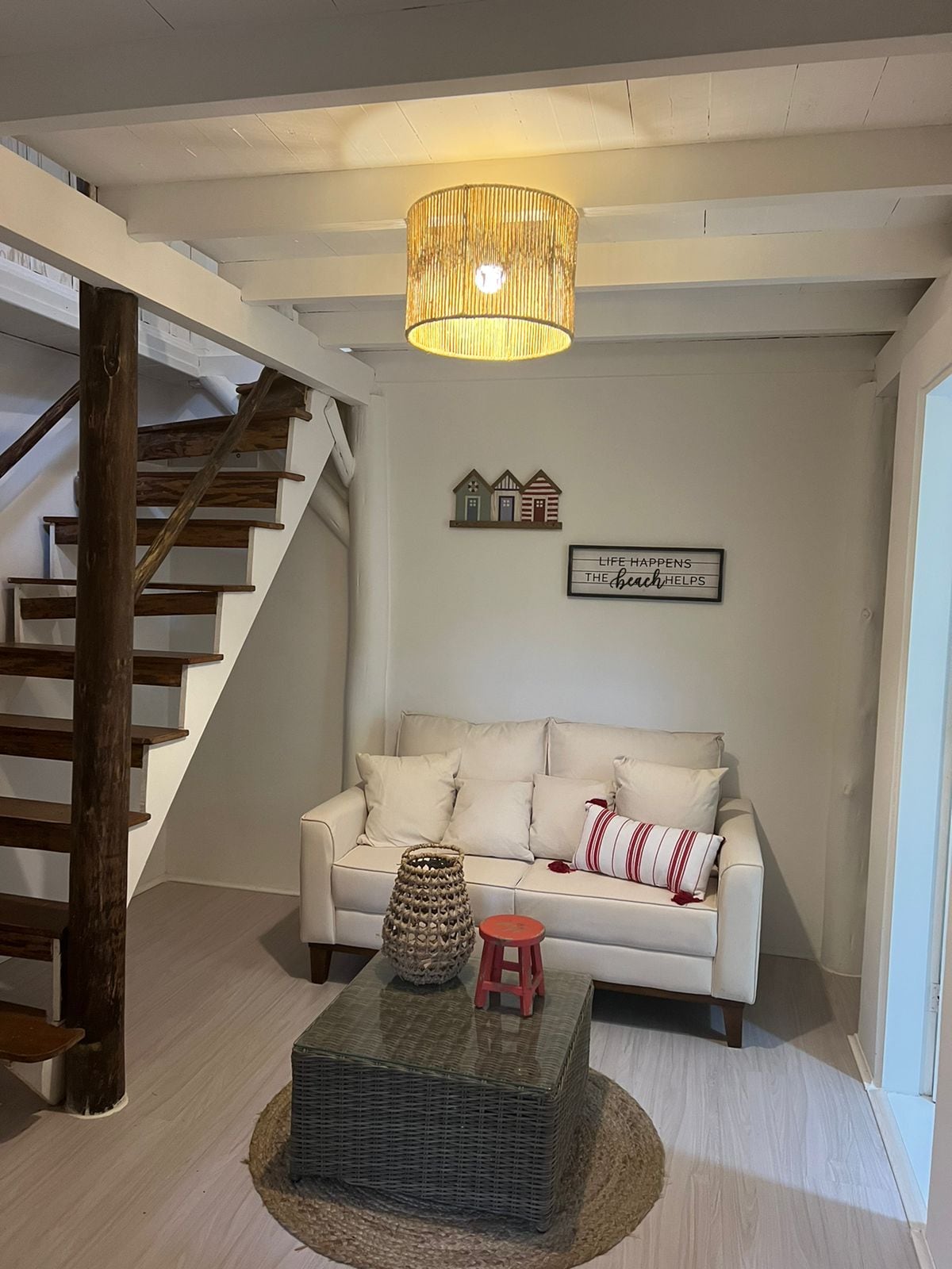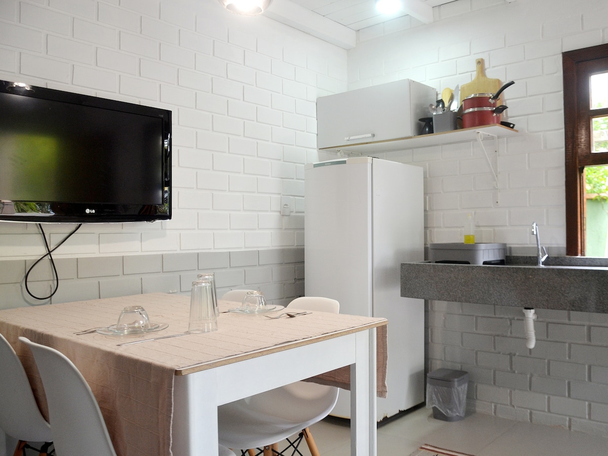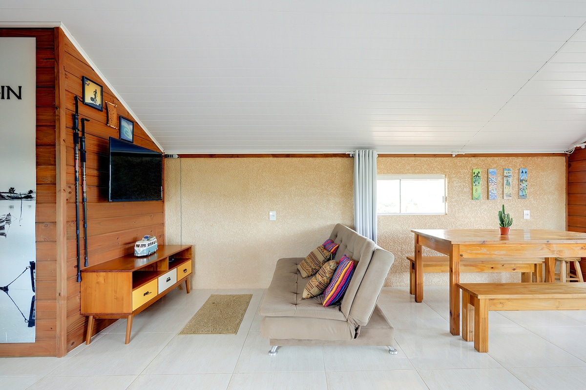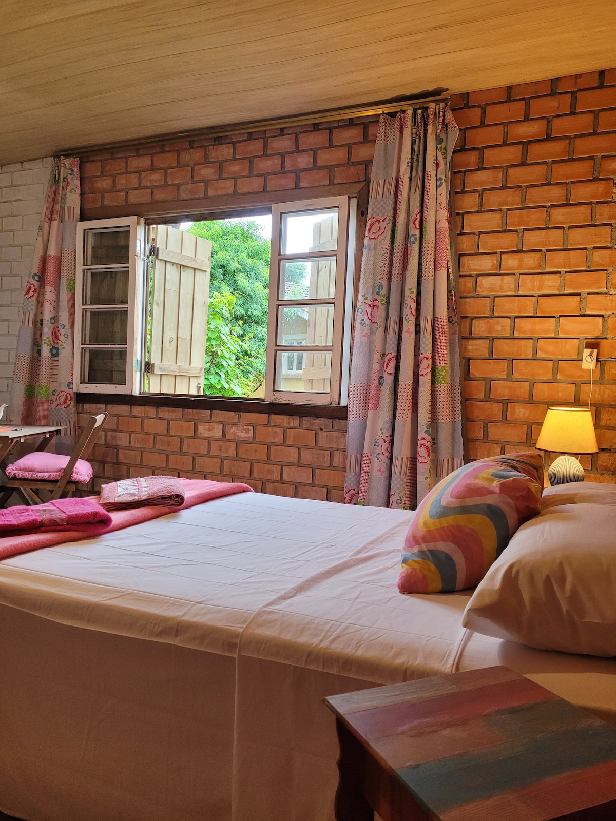 A Suíte Rio da Madre encanta pelo charme e pela integração com um jardim lindo que envolve toda a acomodação. No mezanino climatizado, há uma cama de casal e um beliche aconchegante. No térreo, sofá, Smart TV, geladeira e banheiro completo garantem praticidade. A estadia fica ainda melhor com a cozinha compartilhada, perfeita para momentos leves e acolhedores.