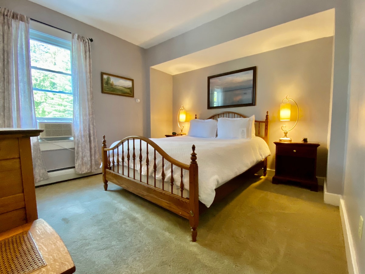 Bright room, 2nd floor queen bed, cotton sheets, own bathroom, sleep sofa, and deck. Private and close to where you want to be: four minutes' drive to Deerfield Academy, Eaglebrook or Bement, 17 miles to Northampton and Amherst and their colleges. We bring a breakfast to your door to start your day right - because it’s not just AirB! If you like a secluded place, you will be happy here with us and we will respect your privacy. The entrance is the only shared space. (Also have a king room!)