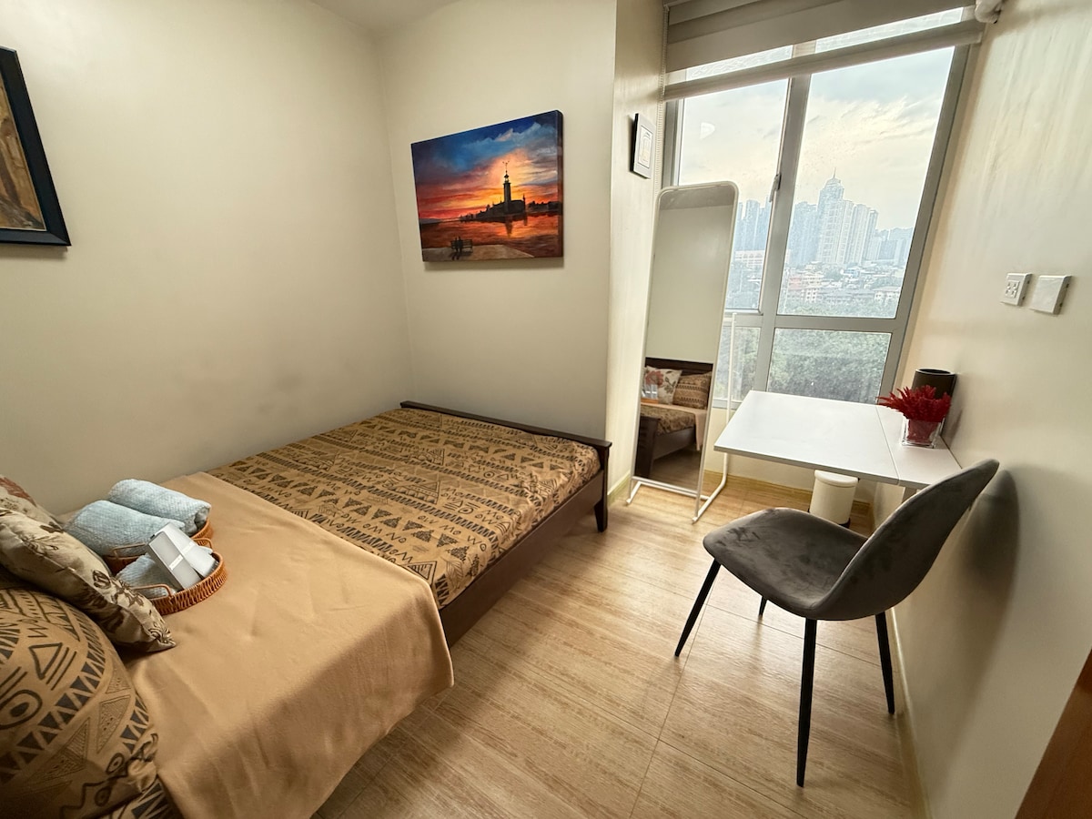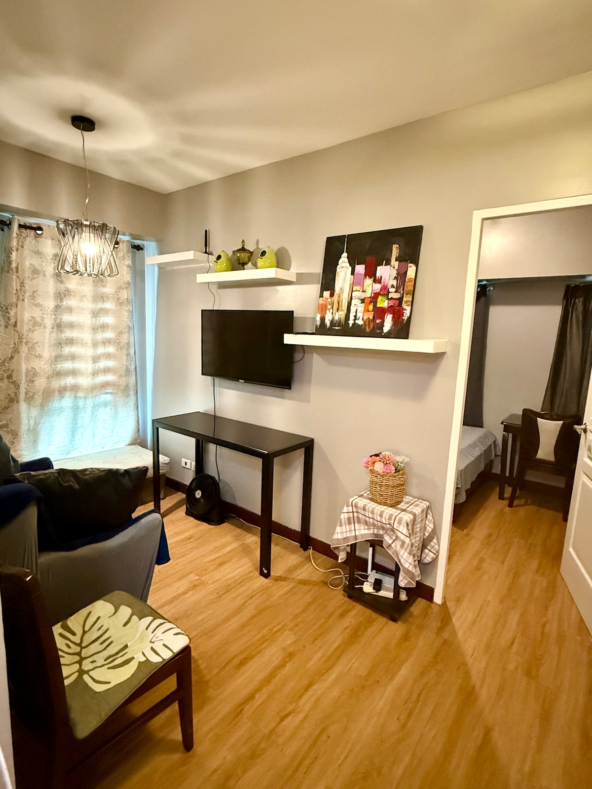 Escape to this charming succulent-themed one bedroom unit perched high in SM Light Residences Tower 1. Enjoy the convenience of mall access, blackout blinds for restful sleep, and a captivating view of the pool amenities. Whether you are working or exploring, you will enjoy the high-speed internet and landline, Smart TV (pre-loaded w/ Netflix and Disney+ subscriptions), and kitchenette, while being just moments away from the central business district. Your cozy retreat awaits!