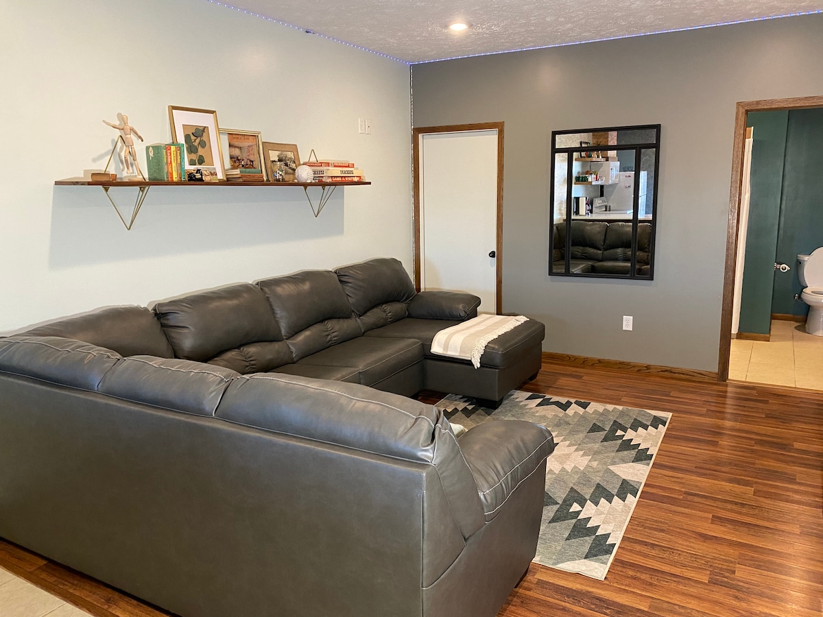 Escape to our Charming Guesthouse a perfect blend of comfort and relaxation. Step outside to enjoy a peaceful patio with a soothing waterfall. Stay comfortable A/C and heating, and cozy up next to the beautiful fireplace. High-speed Wi-Fi and a large TV are provided for your entertainment. On a fenced 3/4 acre lot, access to an outdoor firepit perfect for evening relaxation. Located in the heart of Omaha, you’ll enjoy full city access while still retreating to a peaceful, private setting.