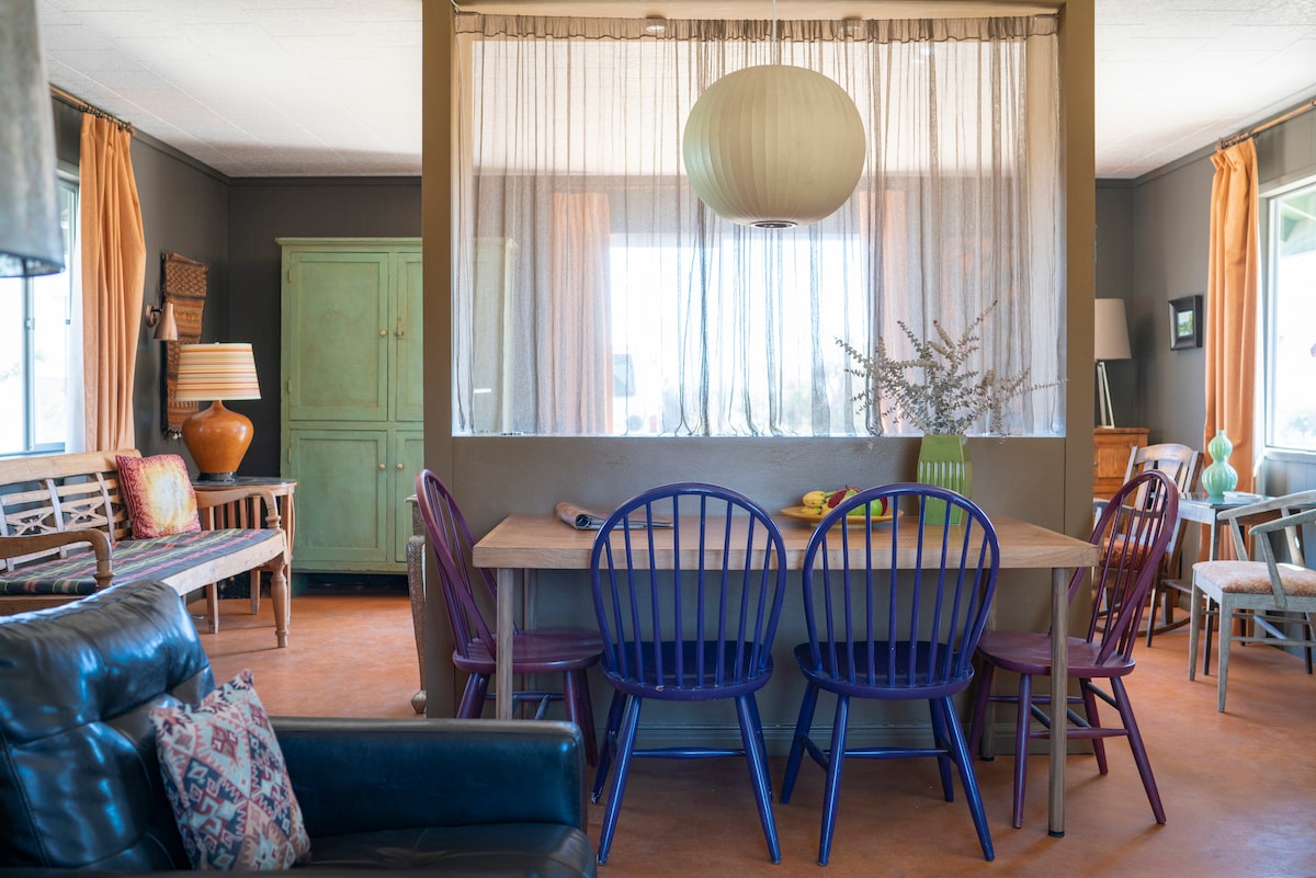 Welcome to Rancho Pionera, an inspired desert ranch escape surrounded by breathtaking views and a 5-min walk to Pappy & Harriets and historic Pioneertown, designed with modern comforts + vintage nuance. Work remotely or lose time escaping work 'off grid' and clearing your mind in the Hot Tub while breathing in 360° views, the Cowboy Pool, communing with Joshua Trees, Stargazing, or connecting with friends in Western retreat mode!