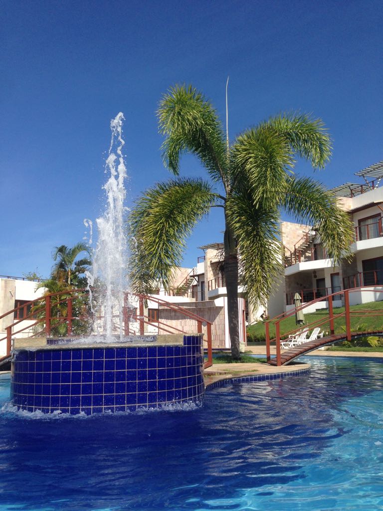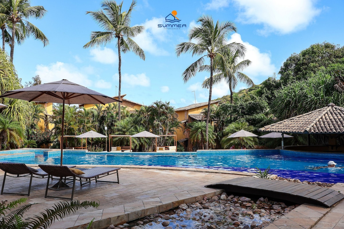 Lindo duplex mobiliado, frente jardim. Acomoda até 6 pessoas, JÁ INCLUINDO CRIANÇAS. Tem 2 quartos, um com cama de casal e outro com 3 de solteiro uma sala com sofá-cama duplo. Todos os ambientes climatizados. Dois banheiros completos. Cozinha bem equipada, tem purificador de água. Wi-Fi próprio. Ótima área de lazer, piscinas, sauna, bar molhado, restaurante que serve CAFÉ DA MANHÃ e refeições com ótimos preços . Fica à 180 m da famosa rua principal, e à 5 minutos (a pé) da praia do centro.