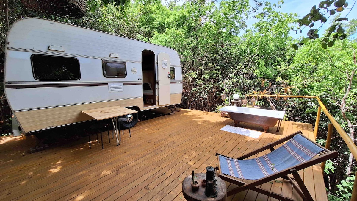 "Viva uma experiência única em nossa hospedagem exclusiva: um trailer Karmann Ghia original de 1979, Ótima localização estacionado em um deck entre as árvores. Reviva a nostalgia em um ambiente encantador, onde o passado se encontra com o presente. Desfrute de conforto, natureza e estilo vintage em uma banheira dos anos 50, cercado pela natureza exuberante de Pipa, uma região do nordeste onde o calor encontra o frescor da mata.