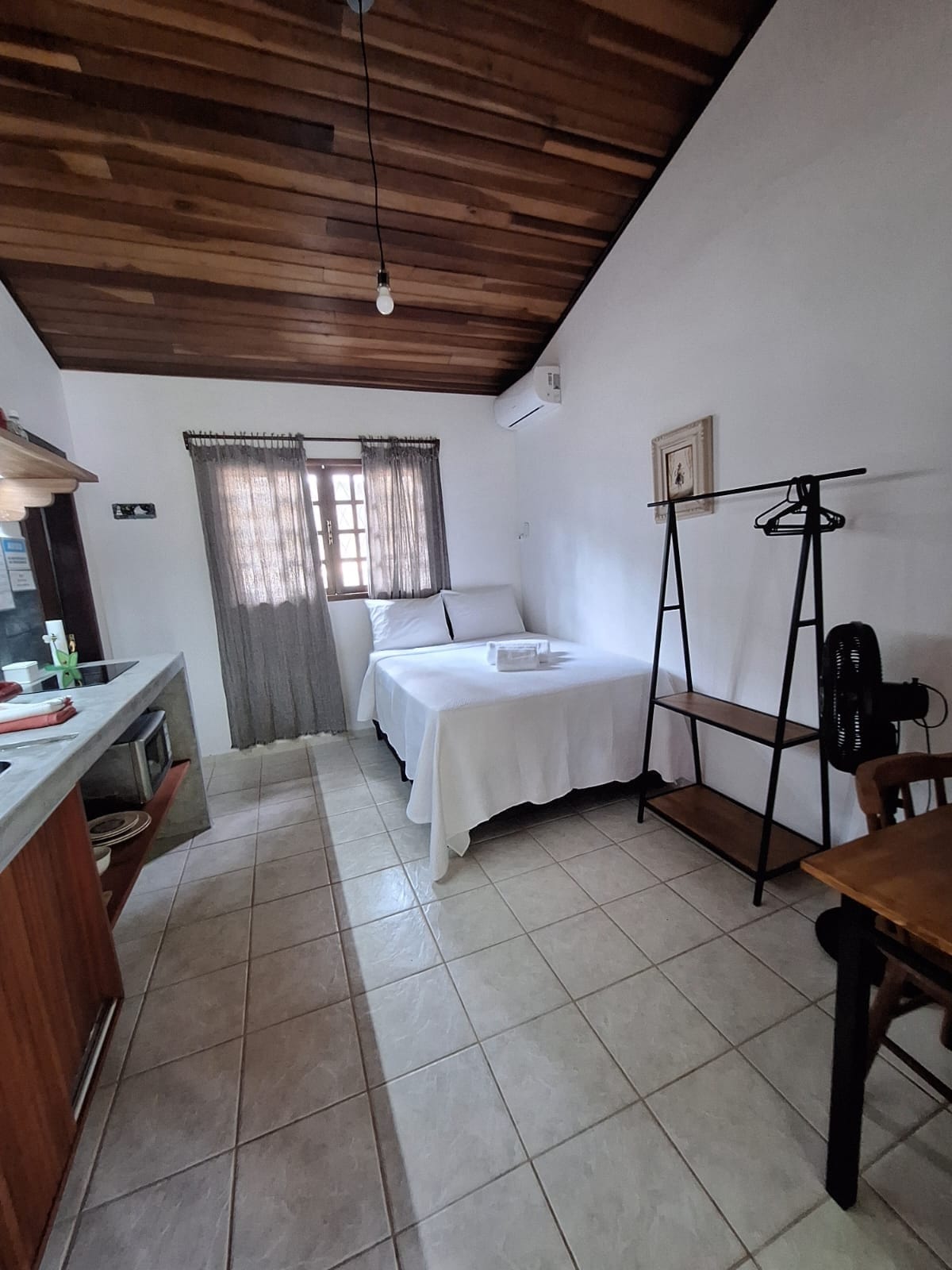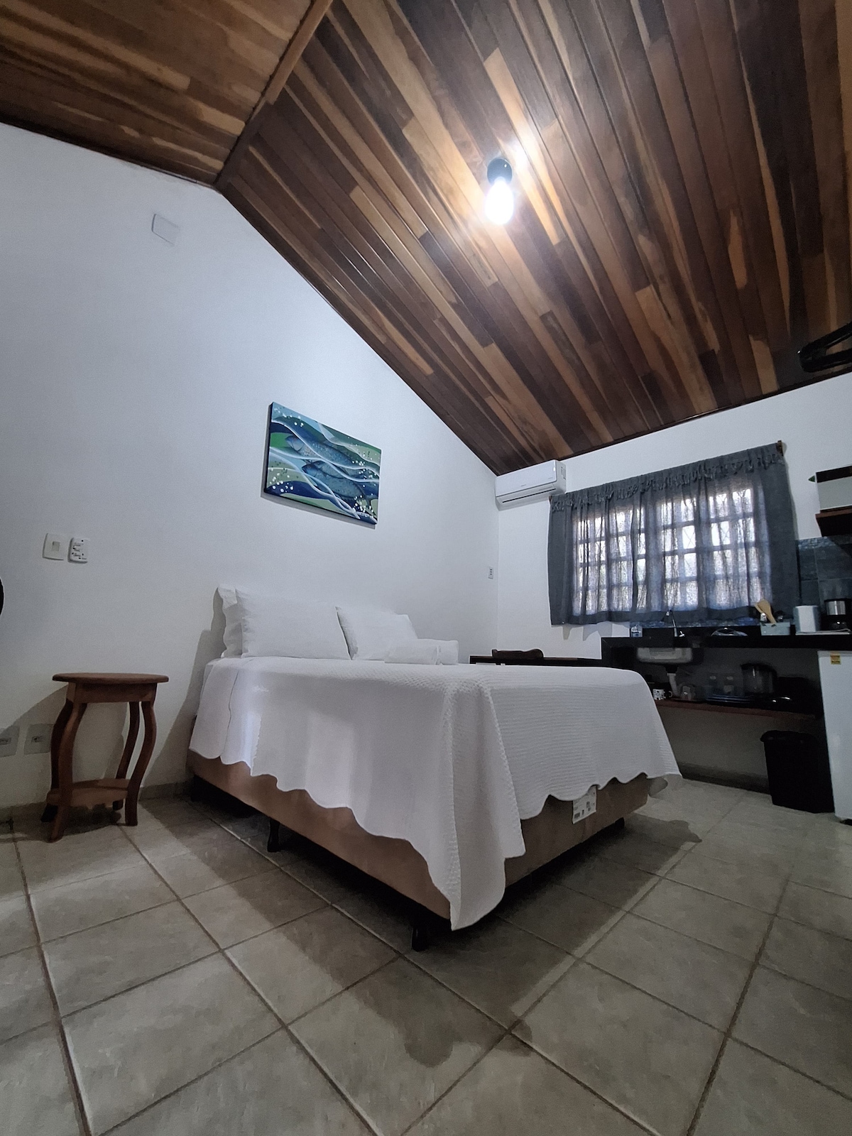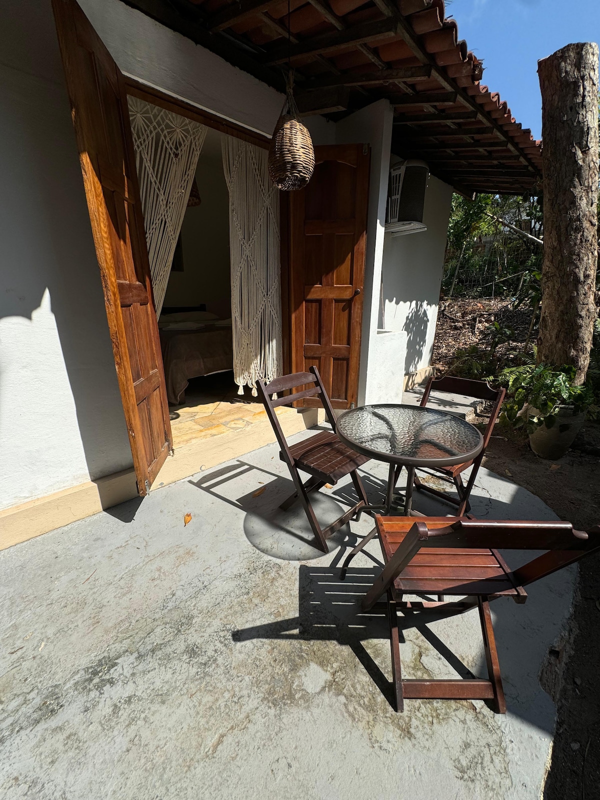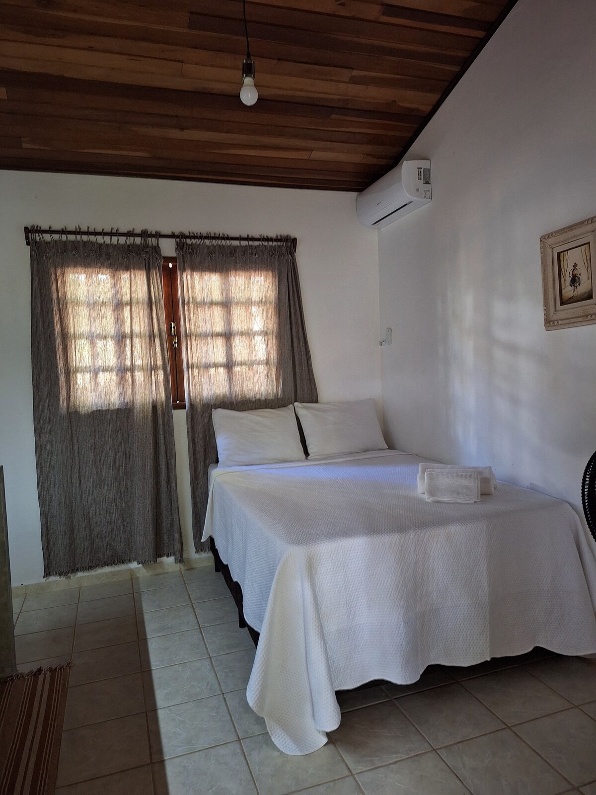 Chalezinho Suite — Cozy & Independent Perfect for guests seeking privacy, comfort, and convenience. What the suite offers • Air conditioning • Wi-Fi • Private porch with hammock, table, and 2 chairs • Compact kitchen (minibar, microwave, small electric oven, coffee maker, blender, clay water filter) • Great for preparing your own breakfast and light snacks Shared areas • Outdoor patio with hammock • Outdoor shower