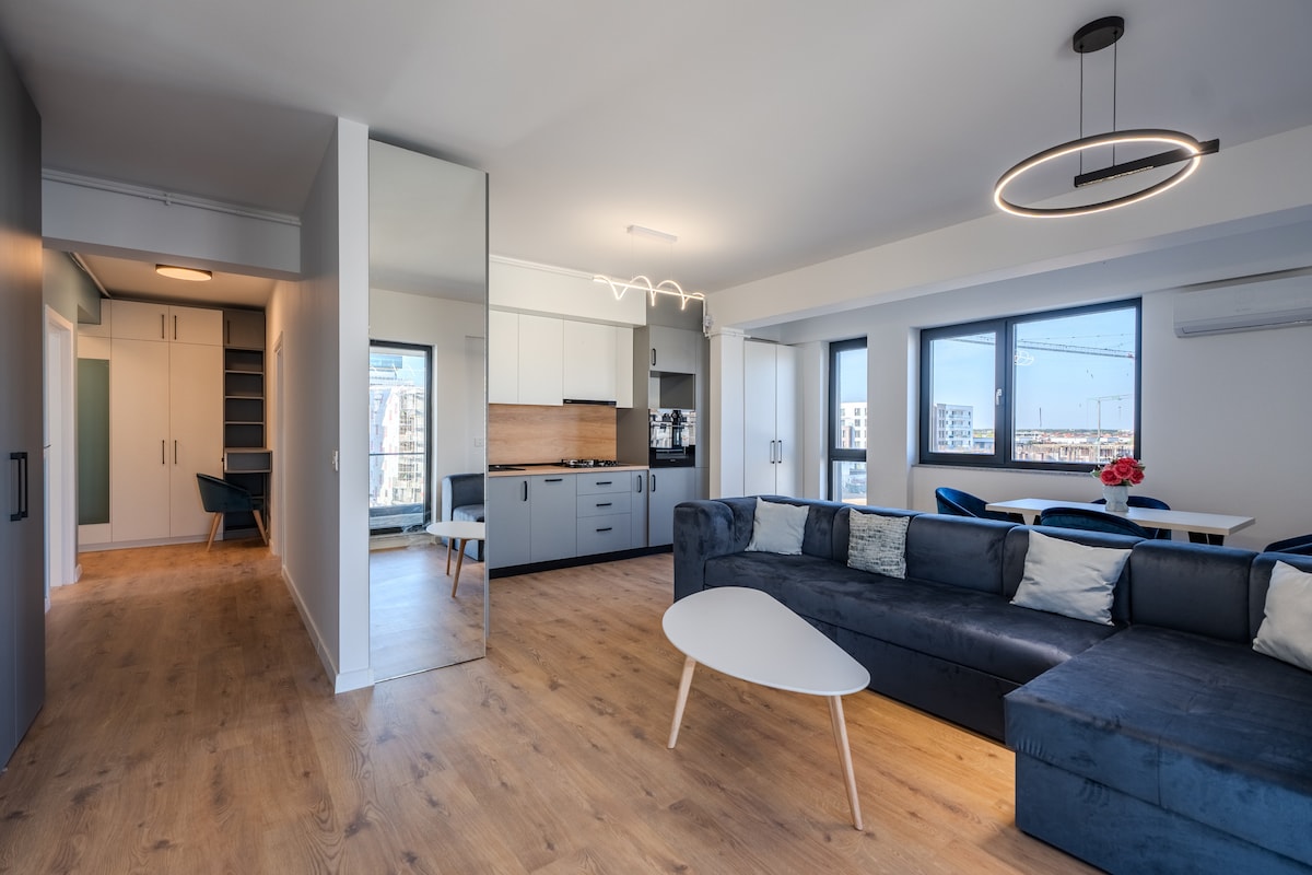 Welcome to your perfect getaway! This elegant and modern 49m² apartment is located 20 min away from both Otopeni Airport and Therme Bucharest and offers a luxurious stay with its warm parquet floors and chic furnishings. The spacious living area features a cozy sofa, stylish chairs, and a marble-accented wall with a smart TV. Enjoy natural light streaming through floor-to-ceiling windows and the fully equipped kitchen, ideal for home cooking. Perfect for couples or business travelers.