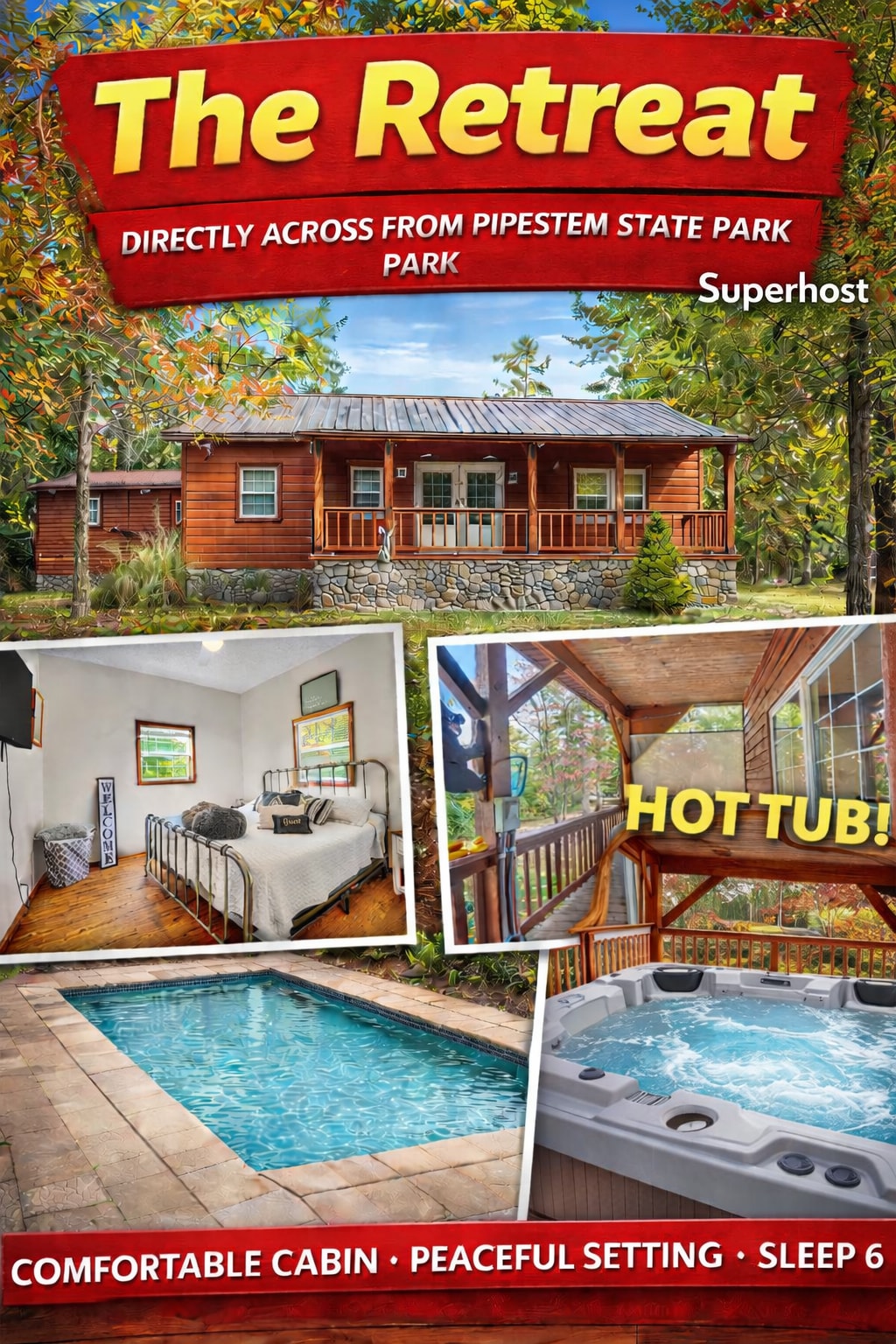 The Retreat/ Hot tub ( drained after every stay) . We are located directly across the road from Pipestem State Park where you can enjoy Ziplining,hiking, Horse Back riding, and more. Back deck with hammock chairs and bonus tiny house connected to main house. Large ceilings and yard which is over 1/2 acre. This property is also very close to one of the few remaining Drive In Theaters. Winterplace is only 30 miles away. Community pool-seasonal . Pet friendly-with pet fee. Come stay in our retreat.