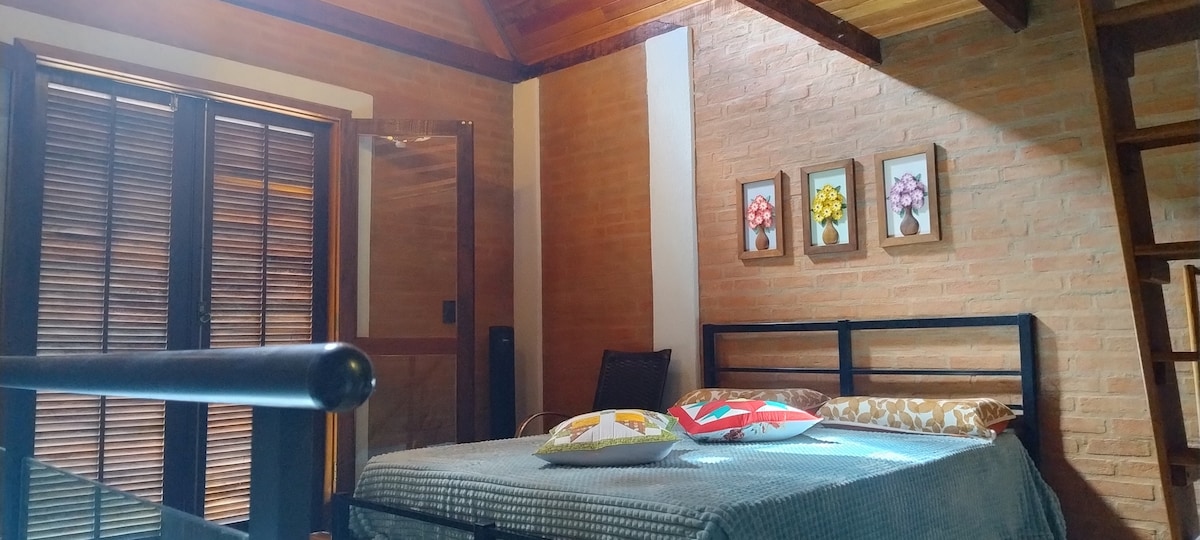 Our chalet offers 45m² of space and accommodates four people in a double bed in the suite and a double sofa bed in the living room. We are just 300 meters from Quilombo Country Club, which offers outdoor pools with day use options directly on site. We are also close to the cities of Aparecida and Cachoeira Paulista, popular destinations for those seeking to experience the region's traditional religious tourism.