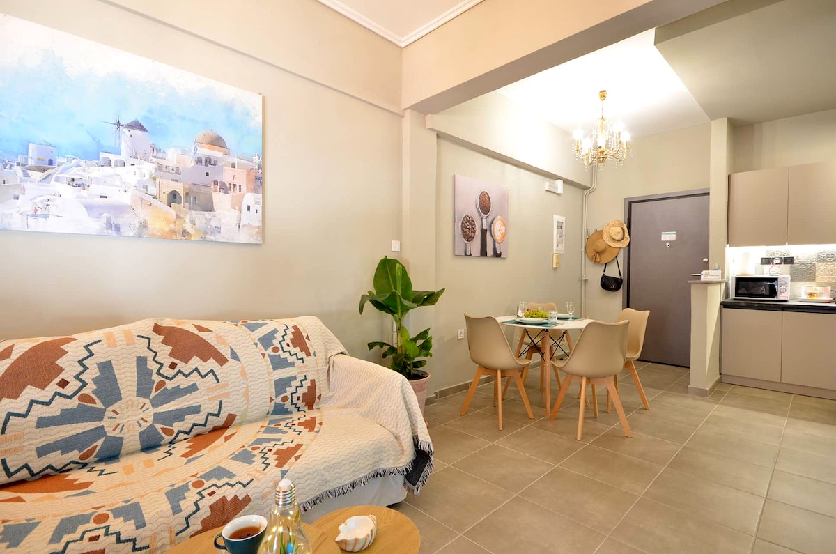 Stylish, spacious (47 sq.m.) one-bedroom ground floor apartment, newly built in 2022. Decorated with every attention to detail, the space aims at providing an enjoyable guest experience. Ideal for couples or families, located at a peaceful part of Piraeus, yet just 5 minutes away from the port by car. This is the place to be either for one night before catching a boat to the Greek islands or for longer stays, since it is fully equipped and the kitchen is suitable for meal preparation.