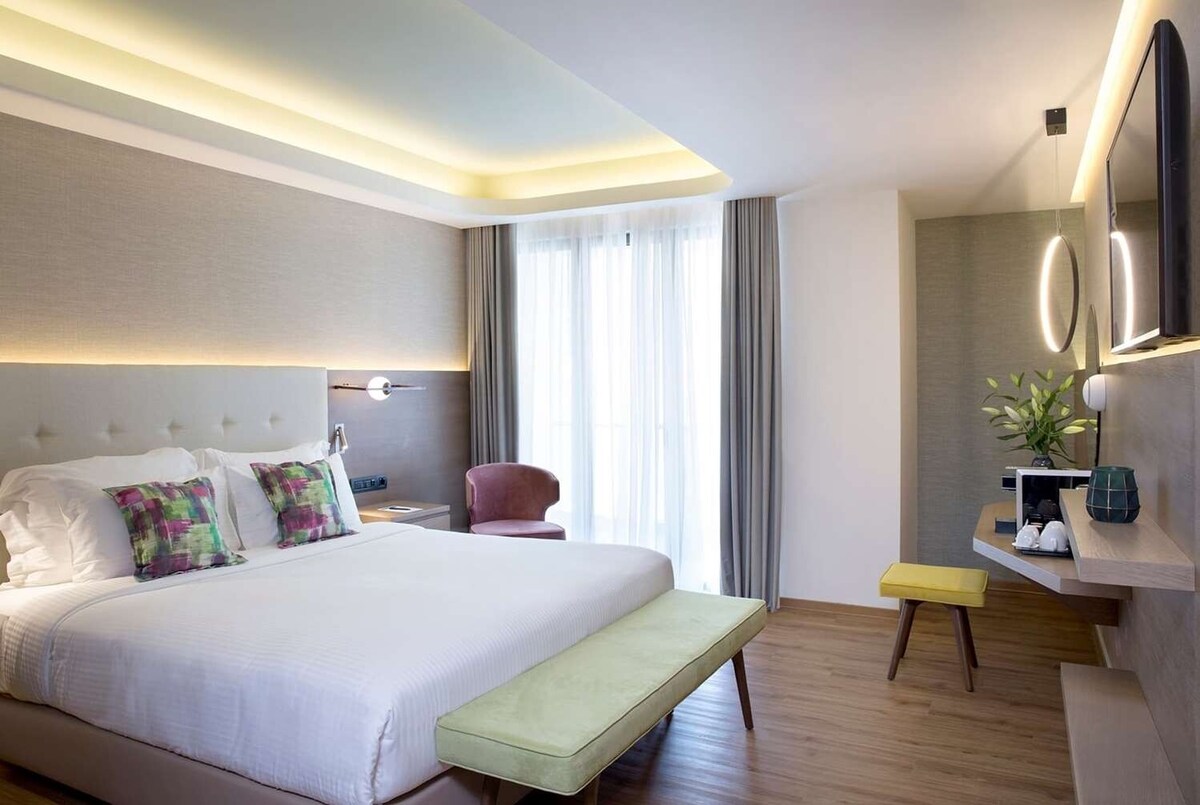 Blend comfort with style. This air-conditioned double or twin room is filled with lots of natural light and a desk area to work from. The private bathroom includes premium amenities. We offer delicious Greek breakfast every day from 07:00 - 10:00 with an extra cost of 10 euros per person.