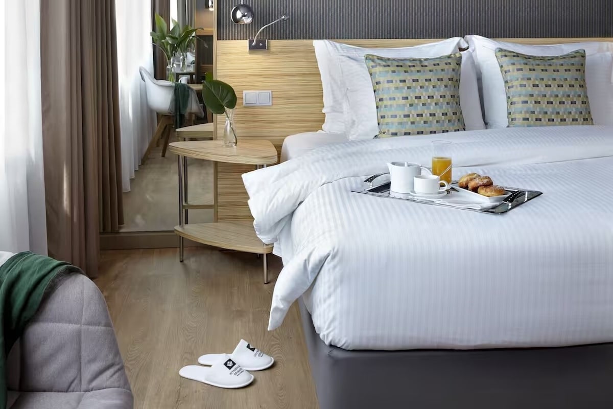 A bright, comfortable room with a clean modern design and soft neutral tones, offering a cozy stay in the heart of Athens. Enjoy a comfy double bed, wooden floors, a modern bathroom with shower, A/C, free Wi-Fi, and a fridge for your essentials. Large windows frame the city views and fill the room with natural light. Start your day with complimentary lobby coffee, and end it on the rooftop with panoramic views and a relaxing jacuzzi.