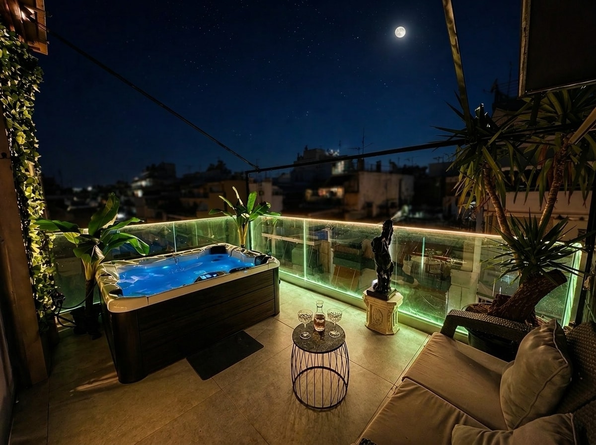 Relax in our tranquil space with an unencumbered view of Acropolis and Athens from inside a jacuzzi of a private terrace. The apartment offers one of the most beautiful and aesthetic decorations that Athens has to offer in a peaceful and quiet neighbourhood. Positioned on the 8th floor the apartment offers incredible views of Lycabetus mountain and Acropolis , as far as the seaside of Athens.