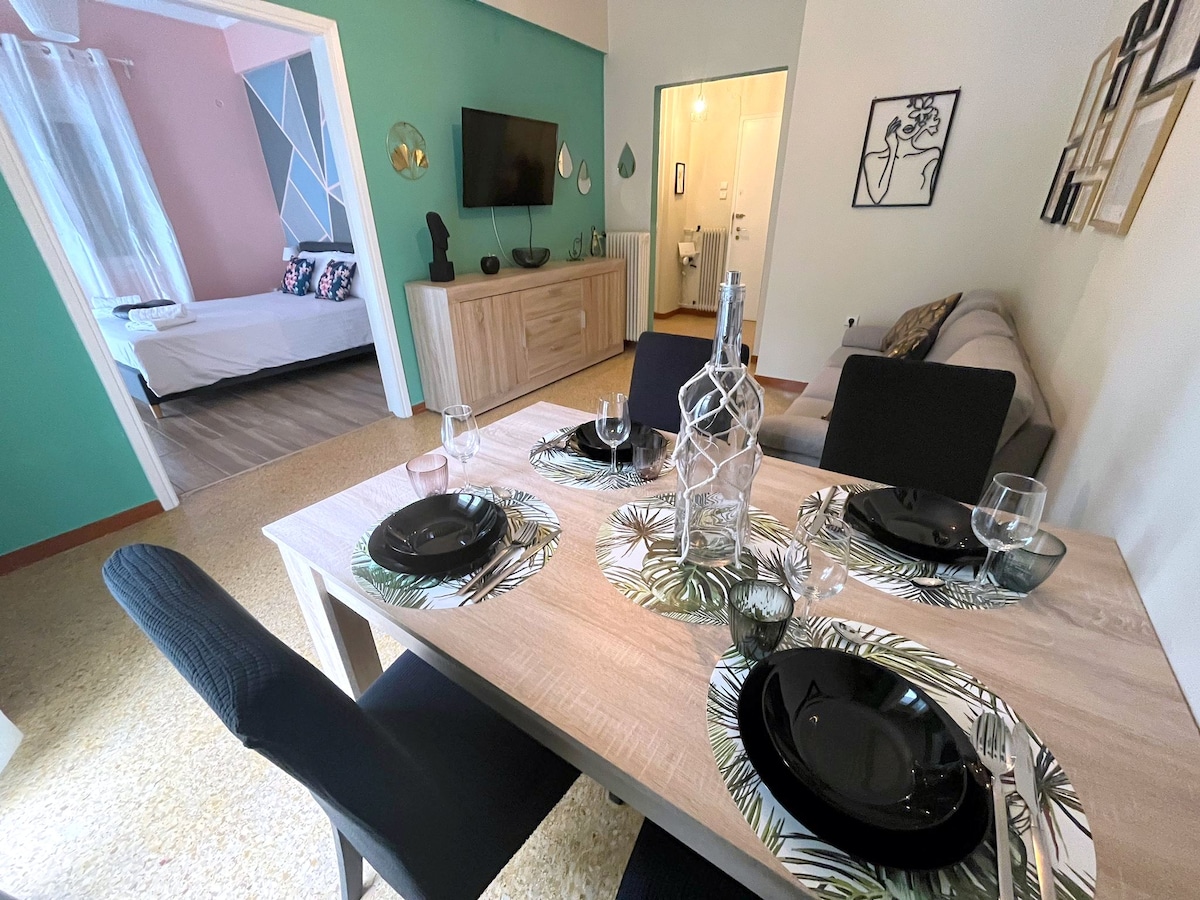 The luxurious apartment with private parking (a 5-min walk) and a 3-minute walk to Pasalimani! Features 3 bdr and 2 bath, including a private bathroom in one of the rooms. Each room comes with a Smart TV and AC for your comfort. Experience luxury in every detail, from the chic furnishings to the electric fireplace. You'll love the convenience of this apartment—with a bus stop right outside, exploring Athens is a breeze! Feel free to reach out for a ride from the airport to your apartment!