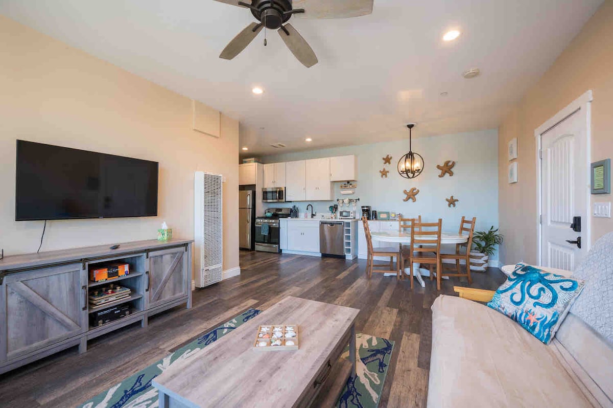 Modern, large 1,381 sq ft two story private Condo 2 blocks from Avila's white sand beach with your own private 3rd story 600 sq ft roof top patio with couches, fire pit, heater and hot tub overlooking Avila's ambiance. Be right in the middle of the action with fishing, surfing, biking, golf, live music, restaurants, shopping all around. With a short drive your in the Central Coast wine country. Check out the video of our property by scanning the QR code found in our photo gallery.