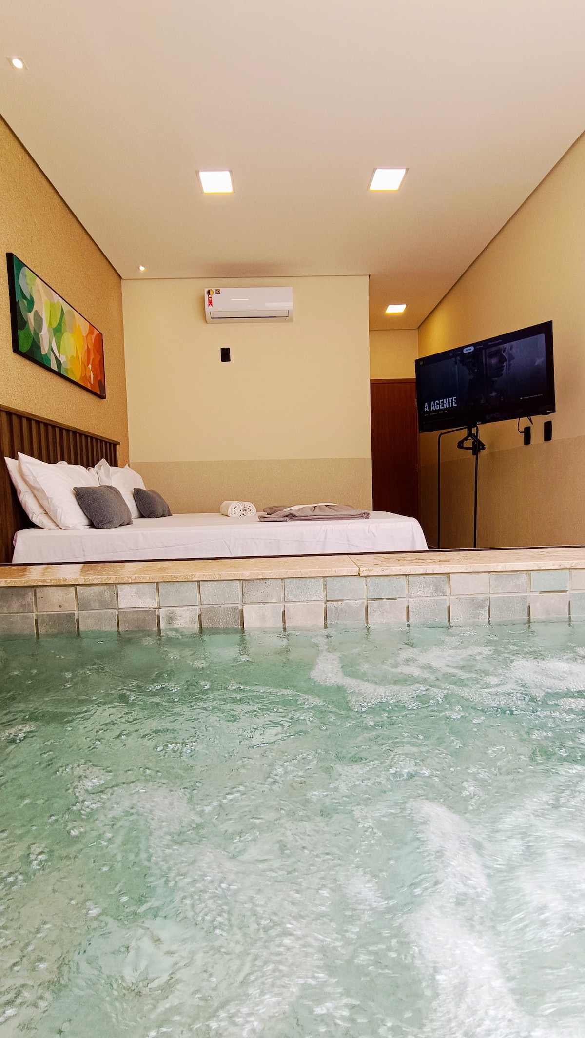 Relaxe neste espaço calmo e cheio de estilo, um ambiente lindo e romântico ideal para casais, quarto com telão, lareira elétrica e ar condicionado, sofá cama amplo e pequena área externa com uma piscininha privativa aquecida por aquecimento solar, iluminada, com hidro e bela cascata, ducha refrescante e disco de arado, louças para preparar um lindo jantar e café da manhã. Um cantinho cheio de detalhes e carinho pra você. Auto-Check In acesso por senha/código.