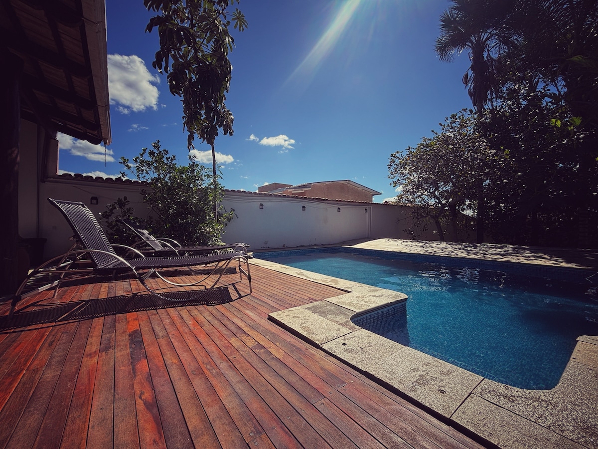 A casa Mariah é uma linda e aconchegante casa para temporada em Pirenópolis, localizada a 400 metros do centro da cidade, com 3 quartos com ar condicionado ( 1 suíte), banheiro social, sala ampla com Smartv 58, com canais fechados e Netflix, sofá retrátil grande e confortável;cozinha equipada; área de lazer com piscina com hidromassagem aquecida, churrasqueira, cervejeira,área gourmet, rede para descanso; portão eletrônico, estacionamento para 3 carros e internet sem fio.