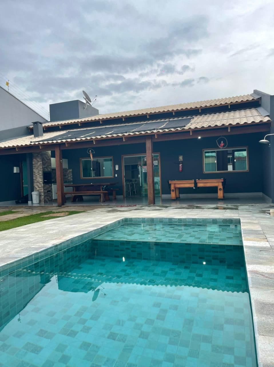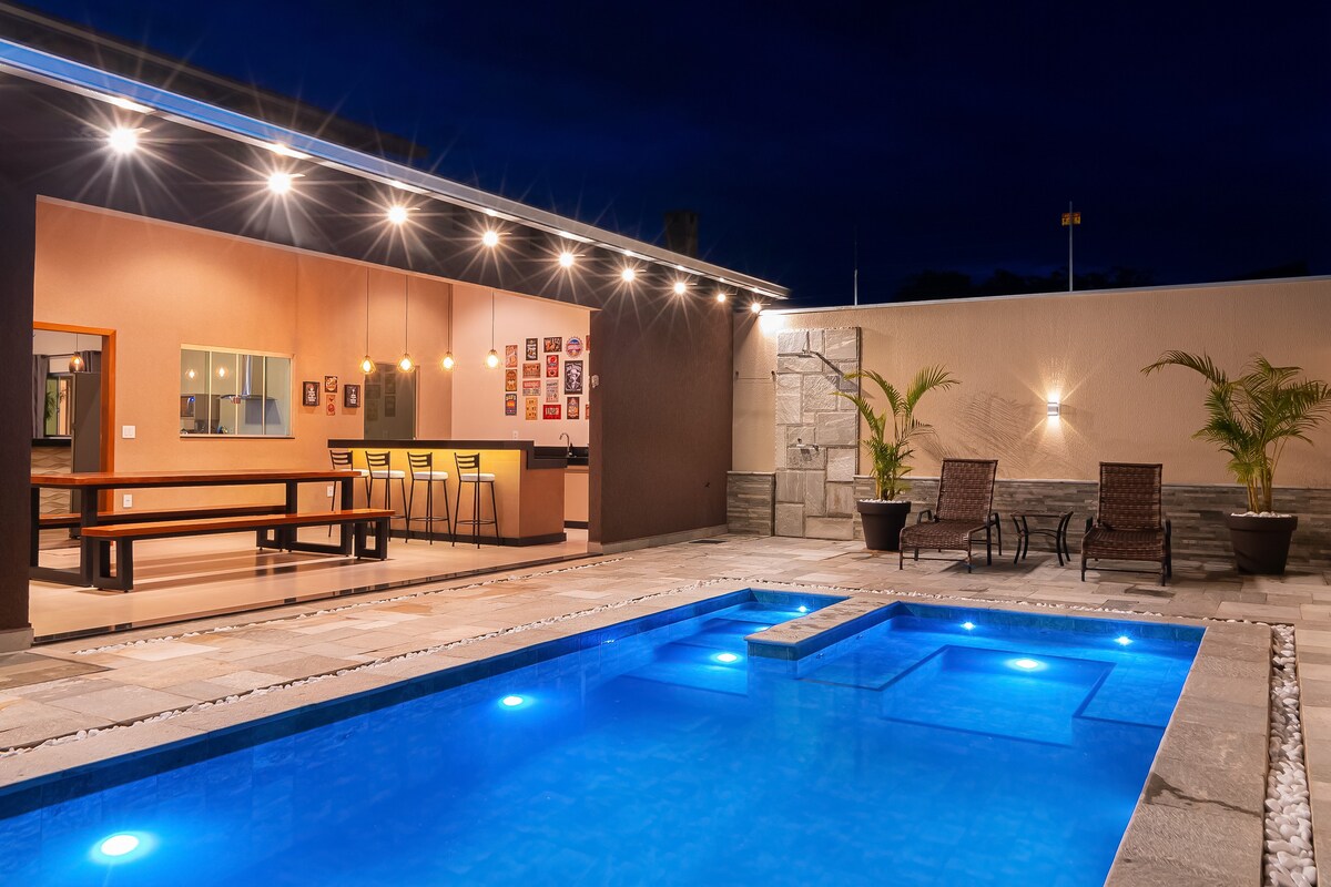 Casa nova, bem localizada e bem equipada - AR CONDICIONADO nos quatro quartos -Capacidade para 16 pessoas incluindo crianças -4 Quartos ,4 Camas casal e 1 Quen sendo duas suítes -3 Colchões avulso Solteirão -1 Beliche no Quarto térreo -1 Wc Social térreo, 1 Wc área de lazer -Sala TV -Cozinha equipada, forno e filtro elétrico, fogão, geladeira, liquidificador, micro-ondas, etc... -Área de lazer, PISCINA AQUECIMENTO ELÉTRICO QUENTE 24H e iluminada, churrasqueira TOP, com grelha. -Garagem -Wi-fi