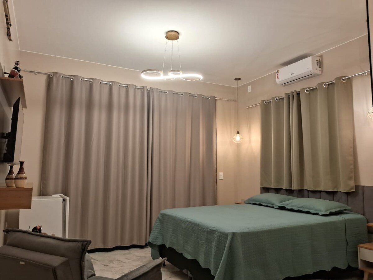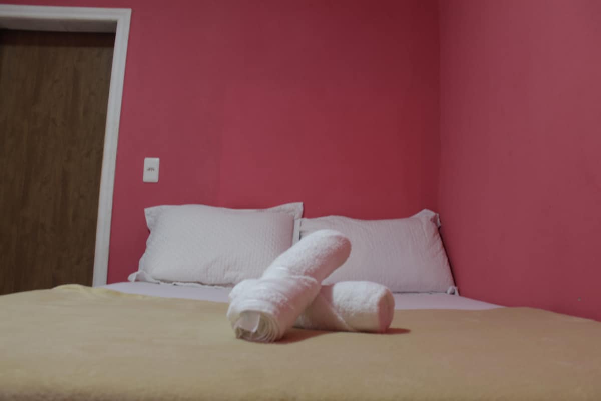 Suíte no quintal de uma casa, como fica no centro, pode andar a pé, local simples mais aconchegante, tem roupa de cama e banho , um frigobar e ar condicionado