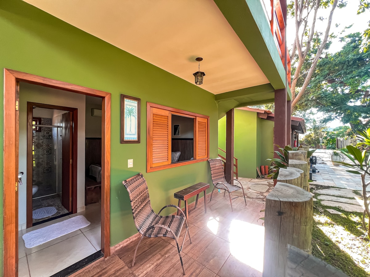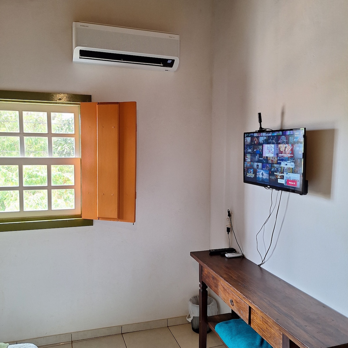 A suíte 4 é ampla e arejada e com janela para o quintal e fundos da pousada. Não possui varanda, apenas janelas grandes. Equipada com ar condicionado, tv e frigobar e ventilador de teto. Uma cama de casal e um bi cama para dois solteiros.