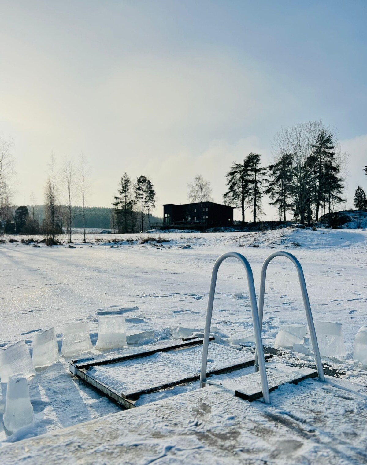 桑拿、湖泊和按摩浴缸的Sääksvilla