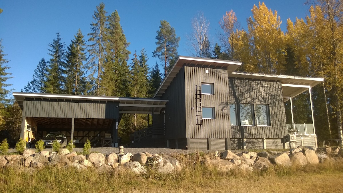 A new, well-equipped log cabin built 2018 with a good access to the main roads and nearby cities. The cabin is located on a hill with a great view to a big lake. The cabin is surrounded by great berry forests, hiking trails and a lake rich in fish. In the cabin you have a wood burning sauna, a fireplace, a grill shelter, a hot tub and a boat. Winter time you can do cross-country skiing, downhill skiing, snowboarding, ice fishing and snowshoe trekking.The nearest ski center is in Sappee (30km)