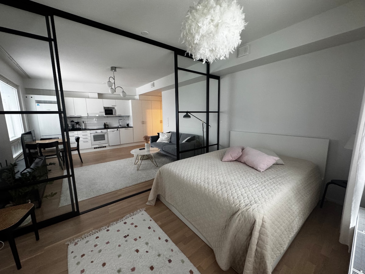 Tässä valoisassa ja neliöitään isomman tuntuisessa kulmahuoneistossa ikkunat sijaitsevat kahdella eri seinällä, joten lattiasta kattoon olevista isoista ikkunoista ja ranskalaiselta liukuoviparvekkeelta avautuvat mahtavat näköalat yli Nokian. Tähän asuntoon pääsee myös pidemmäksi aikaa. Brand new furnished studio in the city center of Nokia. From the top floor, this apartment offers an amazing view across the town. The apartment can accommodate 1-2 guests.