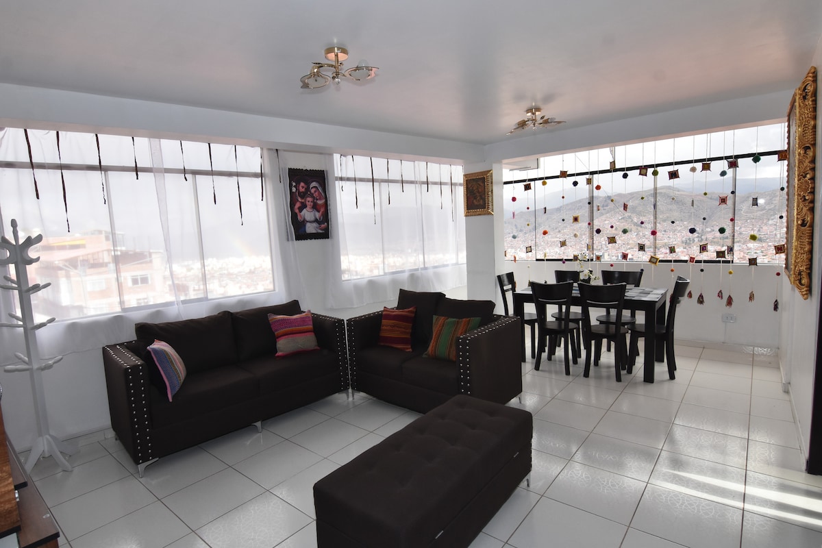 Welcome to TAWA - Luxurious duplex apartment in downtown Cusco, across from a park in a quiet and safe area. High-quality finishes, 3 spacious bedrooms with king-size and twin beds, and electric heaters! 3 private bathrooms with 24-hour hot water. High-speed internet, Smart TV, fully equipped kitchen with filtered water, laundry facilities, mini-gym, 2 terraces with unique views, and outdoor parking. Just a few minutes' walk from Plaza de Armas. **Located on the 4th floor without an elevator.
