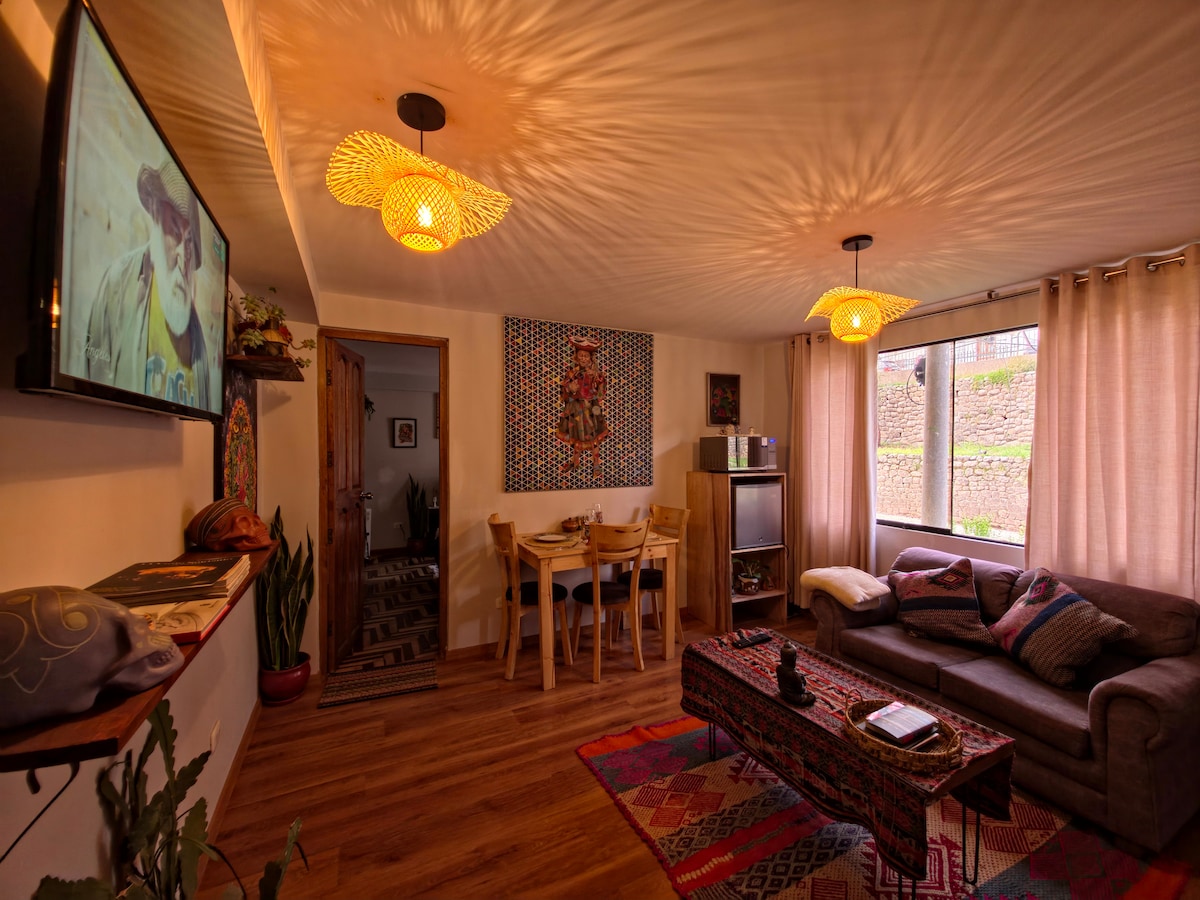 Rustico, moderno y acogedor apartamento de dos habitaciones, 2 baños completos con sistema de agua caliente a gas, inclusive en grifos de cocina, decorado cálidamente para tener una estadía plena donde todo funcione perfectamente, ubicado a 2 cuadras de la plaza principal Pisac, pero en su interior muy tranquilo y silencioso con calefacción. una motocicleta moderna todo terreno de 6 velocidades a precio especial para nuestros huéspedes Servicio de taxi privado desde el aeropuerto a todo el valle