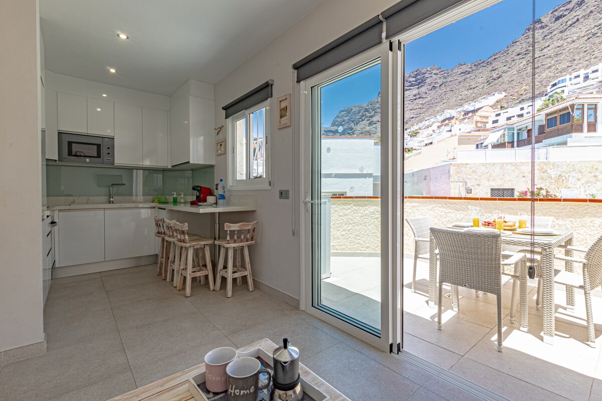 It is an apartment with sunny terrace with a full panoramic view to the ocean, La Gomera island, Los Gigantes cliffs, port and fantastic sunsets every evening. This is an ideal place for couples and adventurous souls. The most beautiful beach surrounded by cliffs is within 5 minutes walking distance. Close to the local bars, restaurants, supermarkets, and other main amenities, it has a perfect location for your relaxing holidays.