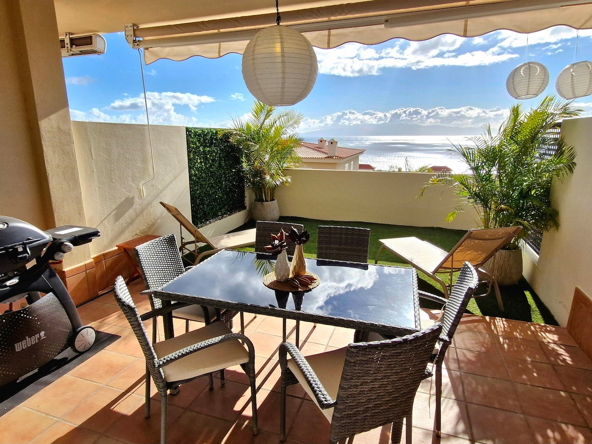 Beautiful modern house! 3 bedrooms, 3 bathrooms, one WC, very big terrace with private heated pool and gardens, magnificent views to the ocean. It is situated just in 7 min walking from the famous Siam Park and a new shopping center Siam Mall. The heating of the swimming pool is 150 euros per a week. We have outdoor camera for security. we´re responsible for ensuring that our listing is safe and compliant with safety regulations.