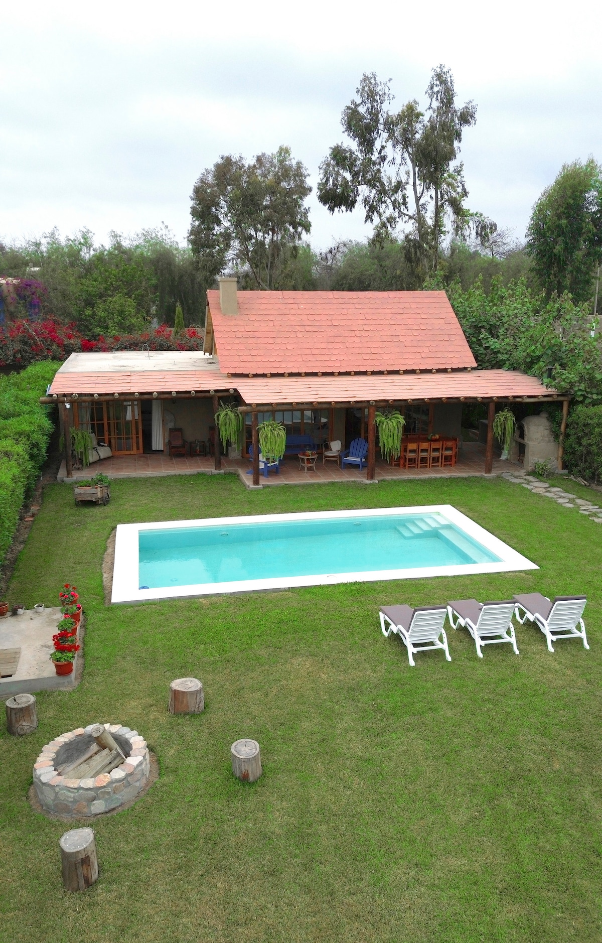 La casita de campo de 100 m2 se encuentra dentro de un condominio vigilado las 24 horas , pero el uso de la casa , el jardín súper grande y la piscina es exclusivo para los huéspedes , Es una casita rústica pero con todas las comodidades básicas :) No contamos con internet! Es importante saber hay unos 15 minutos max de trocha antes de llegar al condominio. La casa es petfriendly (sólo aceptamos una mascota)