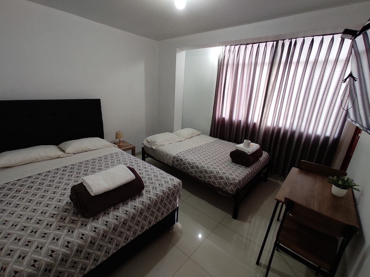 En este alojamiento se respira, seguridad ,tranquilidad, con cochera wifi y cocina, !relájate con toda la familia!, tu familia estará cerca de todo si te hospedas, está ubicado en chacarilla magisterial (la derrama),casi al frente de punto pitza de la tercera etapa de casuarinas,está en carro a casi a 10 minutos de la plaza de armas y también a casi 10 minutos de huacachina. El cuarto delantero tiene proyector