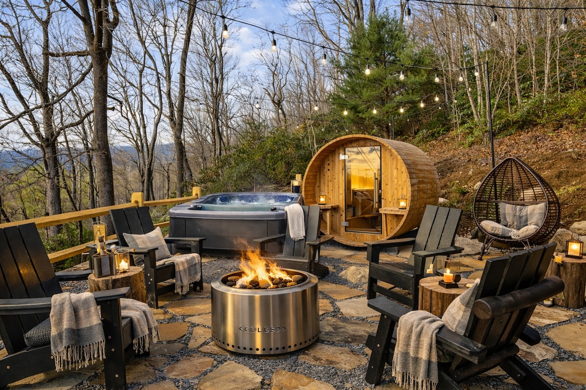 Perfect for a Private Cozy Couples Retreat with privacy for hot tub. View the Milky Way at night or Sunset from the hot tub. And Spacious enough for a Family*Friends getaway! Note: Maps have been wonky since the hurricane, we are 2.5 miles from 184 in Banner Elk, 8 minutes to fantastic restaurants! Your unique retreat experience starts here! YEAR ROUND Mountain VIEW PRIVATE Hot tub SAUNA Separate Gameroom with Bartop and Slots Firepit Comfortable beds Multiple deck seating areas Spa Room