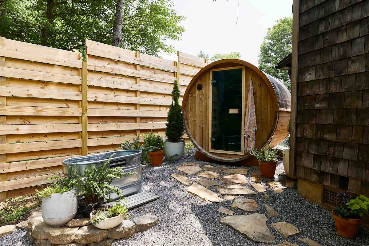 Relax and unwind in our thoughtfully restored, locally focused guest house. Indulge in your private four-person barrel sauna and a refreshing cold plunge tub, meticulously cleaned and refilled between each booking. Just 4 minutes to downtown Black Mountain & surrounded by miles of beautiful trails for hiking or mountain biking. Follow us on IG @cedarandstoneproject to explore the transformation of our guest house and uncover our favorite local tips for dining, hiking, and more!