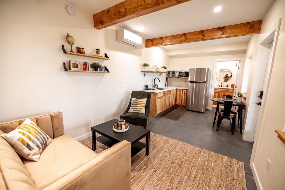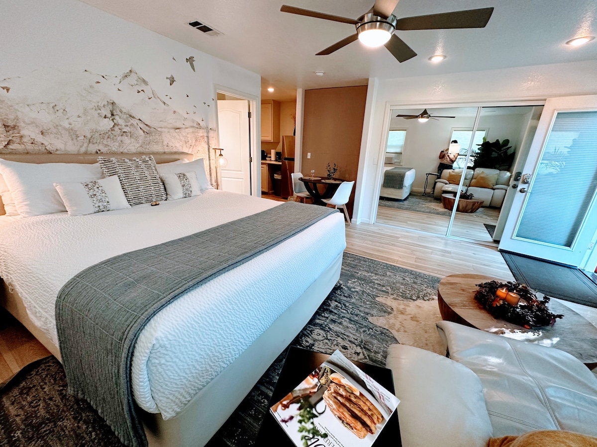 Experience restful simplicity near I-5 and Bethel Church in this modern, light-filled studio designed for peace and comfort. Perfect for solo travelers or couples, it features a California king bed, kitchenette, custom tile shower, and a serene private patio shaded by Japanese maples. Enjoy luxury touches, total privacy, and easy access to restaurants, trails, and all that Redding has to offer.
