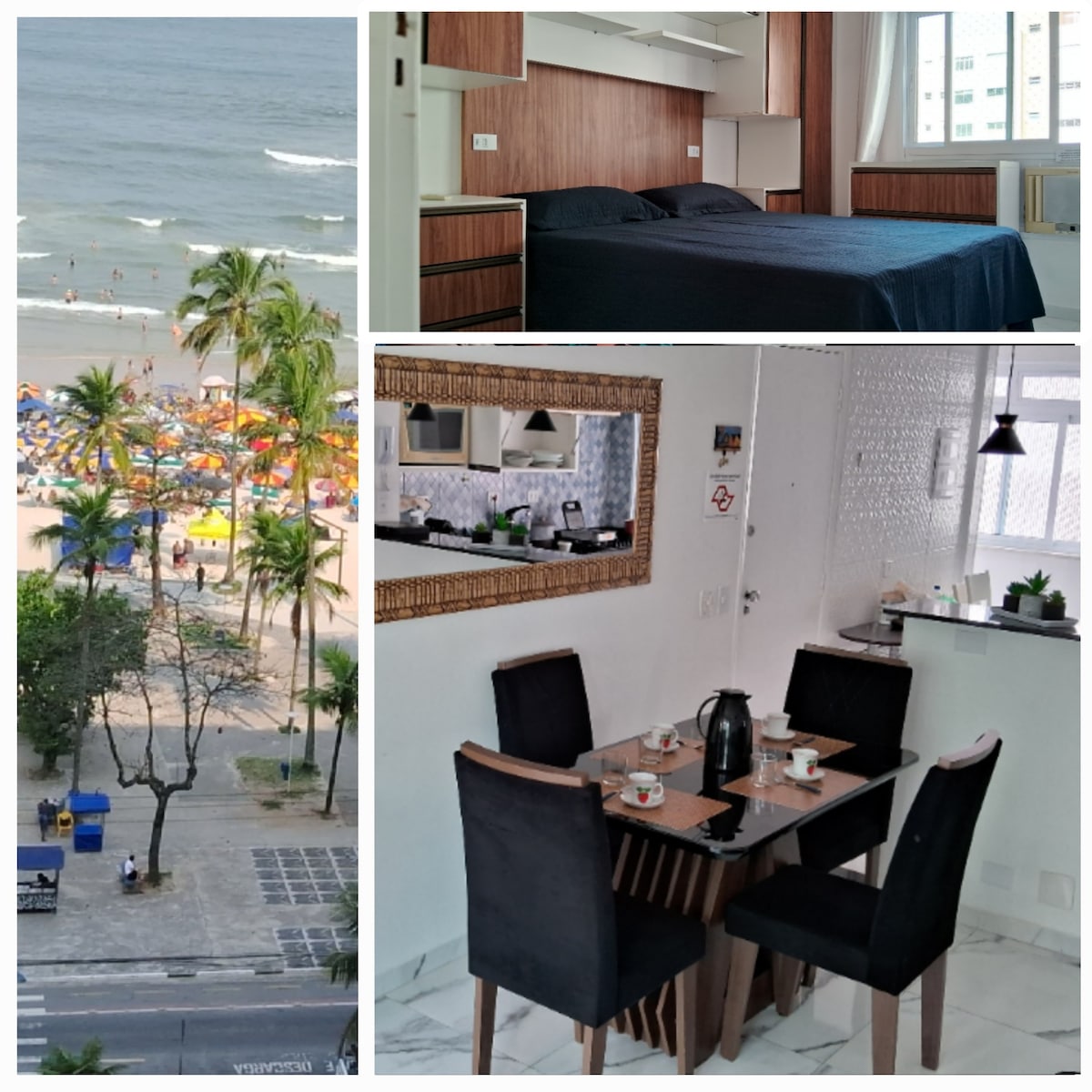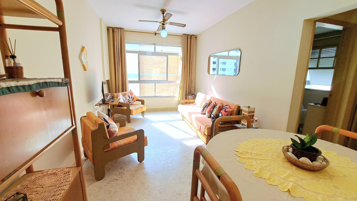 🌴 Beachfront apartment in Guarujá! 📍 Prime location, 🛏️ 2 bedrooms: -1 with a double bed, and one with a bunk bed. 💨 Fans in the living room and bedrooms. WiFi . 🍽️ Kitchen equipped with utensils 🏖️ Beach service included 🍽️ Exclusive restaurant in the building (high season) 🚶♂️ No street crossing, the building is on the sand! 🛍️ Nearby there are: • Market, bakery, restaurants, pharmacy, Guarujá shopping mall 400 m away, there are cinemas 📌 Accommodates up to 4 people.