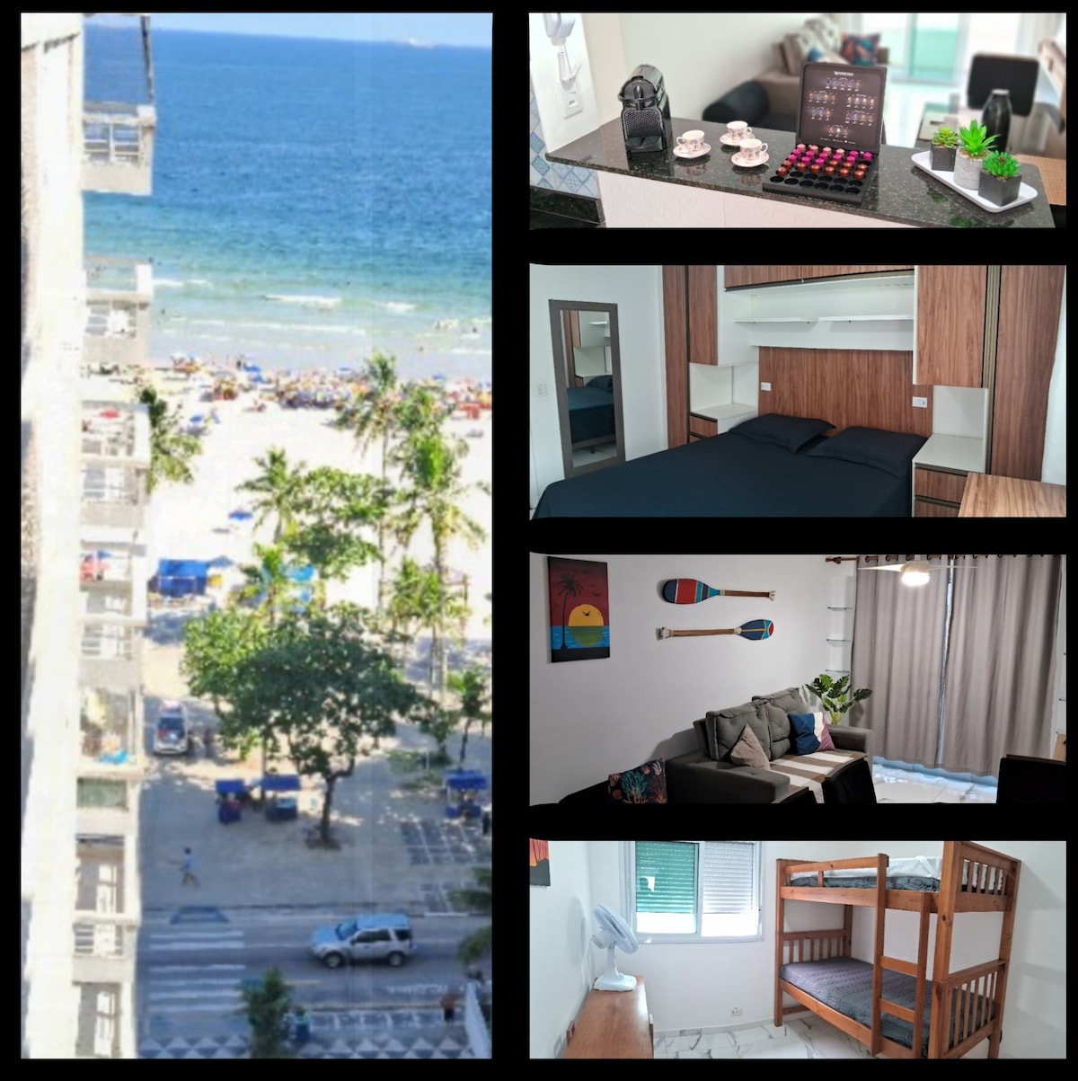 Enjoy the serenity of the seaside in this cozy apartment in Pitangueiras Guarujá. With stunning panoramic views it offers beach service, modern décor, new appliances and kitchenware, and a garage. Relax in the bright living room or on the balcony with the best ocean views. A fully equipped kitchen and a 55-inch smart TV are included. Whether for a family vacation or a romantic getaway this seaside retreat is the perfect choice. Book now and immerse yourself in the beauty of Guarujá's best beach.
