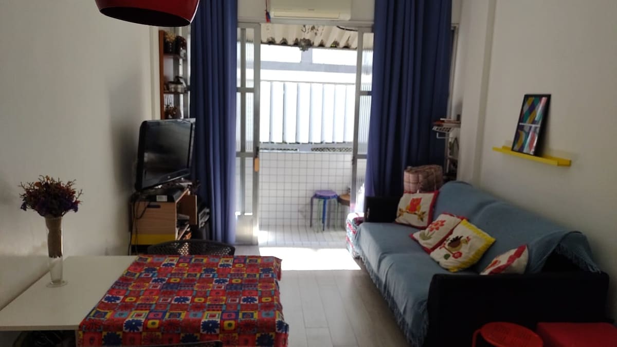 Sol, mar, o cheiro de maresia no ar, os sons da vida acontecendo lá fora enquanto famílias vêm e voltam da praia e de seus passeios. Nosso prédio de frente pro mar vai trazer pra você aquela sensação boa de viagem pra praia! Aqui você vai ter um lugarzinho aconchegante para descansar e se precisar, tem o supermercado Pão de Açúcar ao lado do prédio. E, pra quem não quiser descansar, o apartamento é próximo de diversos bares e restaurantes onde você pode aproveitar a vida noturna de Santos!