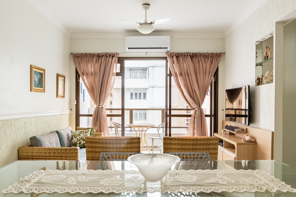 Pé na areia, praia bem em frente, basta atravessar a rua. Ar condicionado Daikin frio/quente na sala e 2 quartos, 2 banheiros, WI-FI ultra rápido, smartTVS LG 50" e Samsung 43".Ampla varanda,vista incrível da praia, mesa,cadeiras, rede. Andar alto, claro,arejado,melhor ponto do calçadão. Ventilador teto ou parede em todos ambientes. Cozinha completa. Excelente localização, faça tudo a pé: padaria,restaurantes,bares, lojas,bancos,mercados,farmácias,shopping,etc. Serviço de praia. Portaria 24 h.