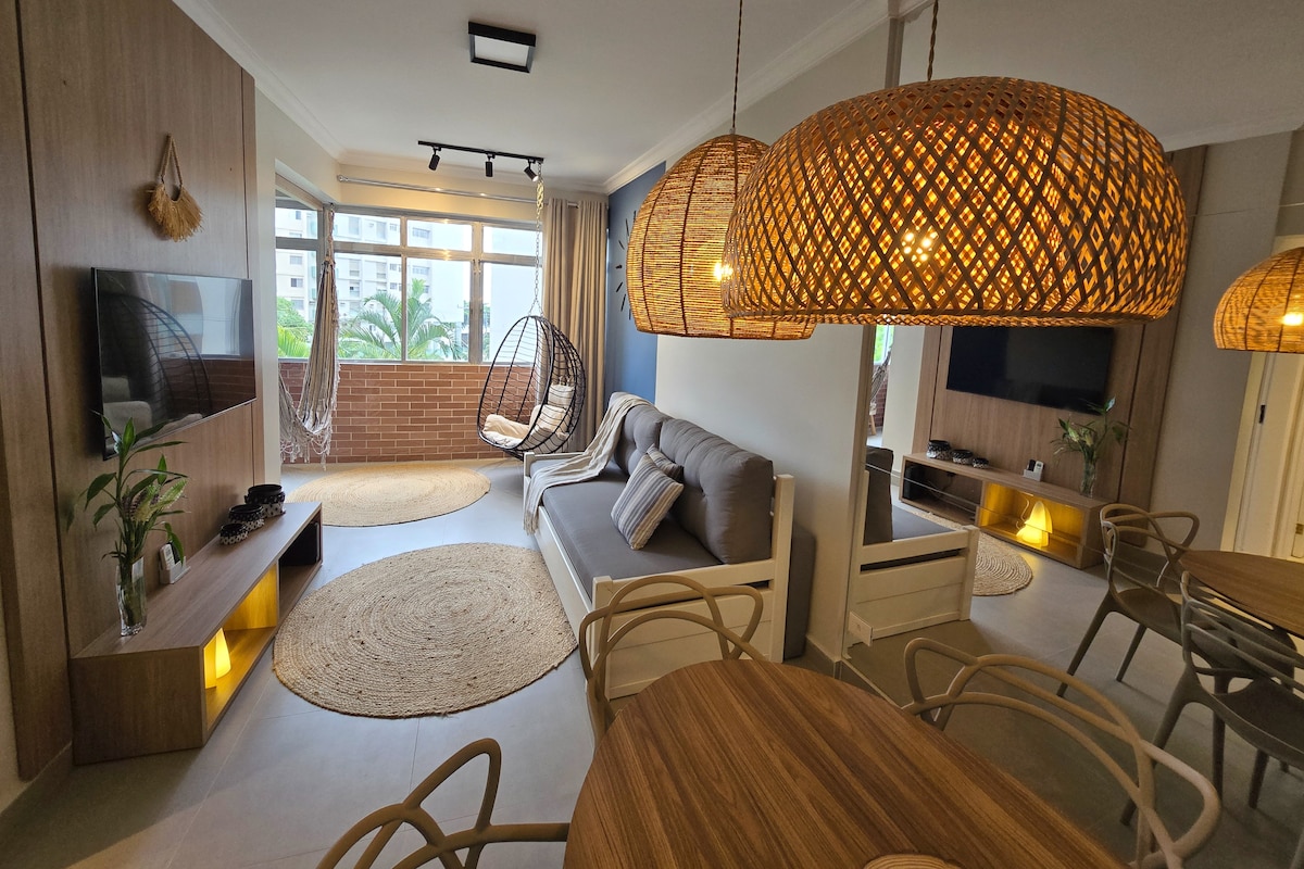 Enjoy the serenity of the seaside in this cozy apartment in Pitangueiras Guarujá. With stunning panoramic views it offers beach service, modern décor, new appliances and kitchenware, and a garage. Relax in the bright living room or on the balcony with the best ocean views. A fully equipped kitchen and a 55-inch smart TV are included. Whether for a family vacation or a romantic getaway this seaside retreat is the perfect choice. Book now and immerse yourself in the beauty of Guarujá's best beach.