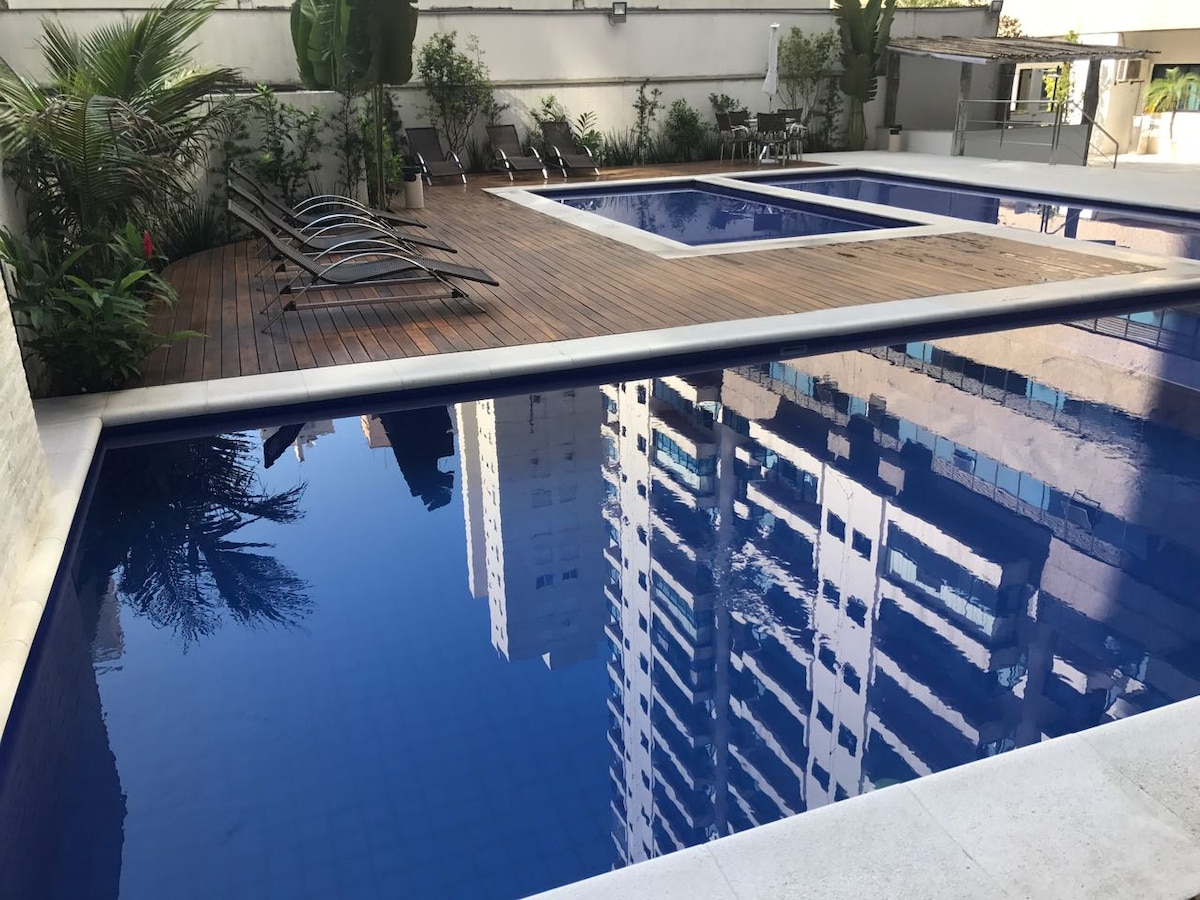 Apartamento mobiliado, apenas 230 metros da praia, menos de 3 minutos a pé. Roupa de cama, toalhas, ar condicionado, TV a cabo, wi-fi, cofre digital, secador de cabelo. Acomoda confortavelmente 4 pessoas, com uma cama de casal no quarto e um sofá cama na sala. Para maior conforto, o Flat conta com recepção 24 horas facilitando o check-in ou check-out, excelente café da manhã (pago a parte), piscina, academia estacionamento e limpeza diária, exceto domingos e feriados.