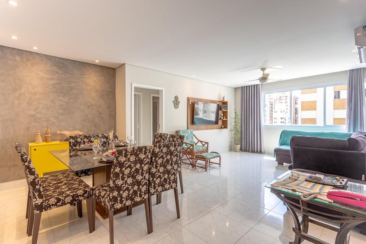 Lindo apartamento reformado na praia de Pitangueiras, Guarujá, com frente total para o mar. Máximo 9 pessoas incluindo crianças. Localizado no melhor lugar de pitangueiras, podendo fazer tudo a pé. Internet 250 megas - Wi-Fi, Netflix. 4 quartos, 3 banheiros, sendo 1 suíte. Ampla varanda. Smart TV 55” na sala. Smart TV quarto. Garagem para um carro Utensílios de cozinha, purificador de água, panela de arroz, sanduicheira, liquidificador, torradeira. 160 m do shopping La Plage.