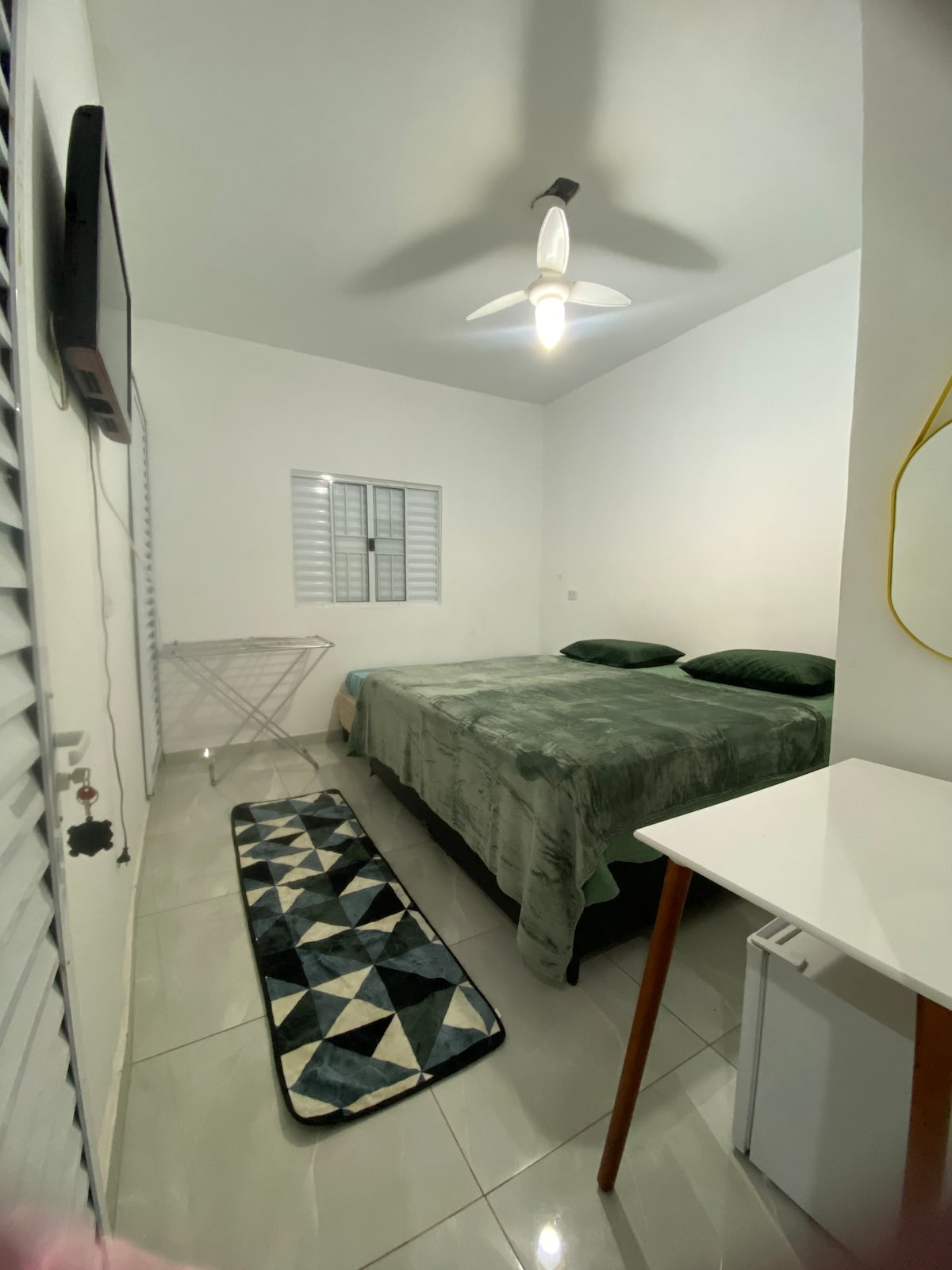 quarto de uma pousada nova que cabem ate 4 pessoas em uma cama de casal e cama solteiro auxiliar a pousada fica a 200 metros da linda praia do guaiuba el Guaruja o.quarto possui banheiro privativo e se pode usar a cozinha da area comum temos umngrande e relaxante patio com redes e rodeado pela natureza com passaros macacos dentre outros a pousada fica de frente para uma mata densa de muito verde e com.varios animas silvestres aproveite para passar días para relajar