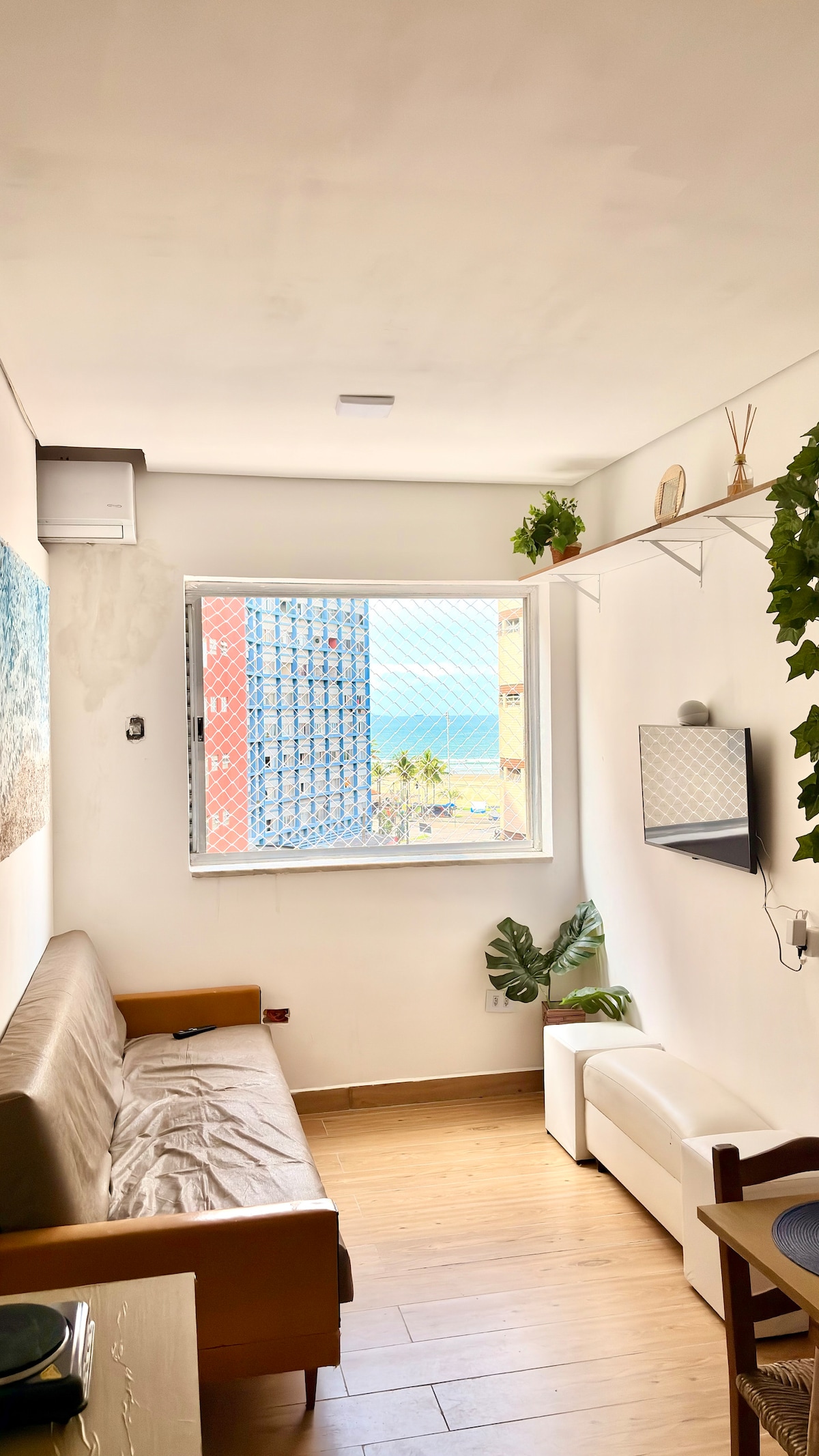 Apartamento em condomínio de luxo - pé na areia - muito bem localizado, próximo ao Gonzaga. Um Studio com tudo que você tem em sua casa, cozinha completa, sala com smart TV 4K e sofá-cama, quarto com cama de casal, armários, escritório e bar, banheiro exclusivo para você e tudo isso com ar-condicionado e varanda com vista para o famoso jardins da orla da praia de santos.